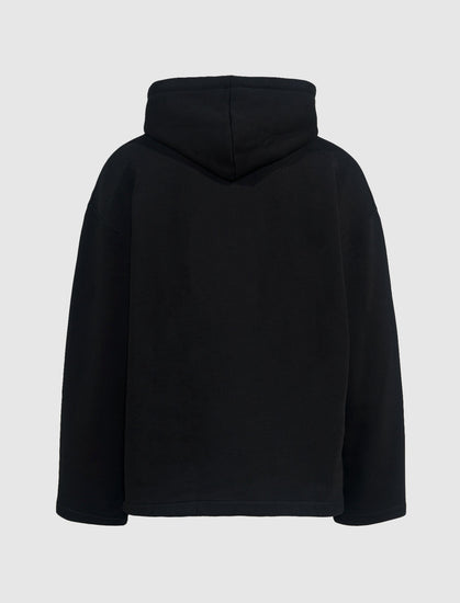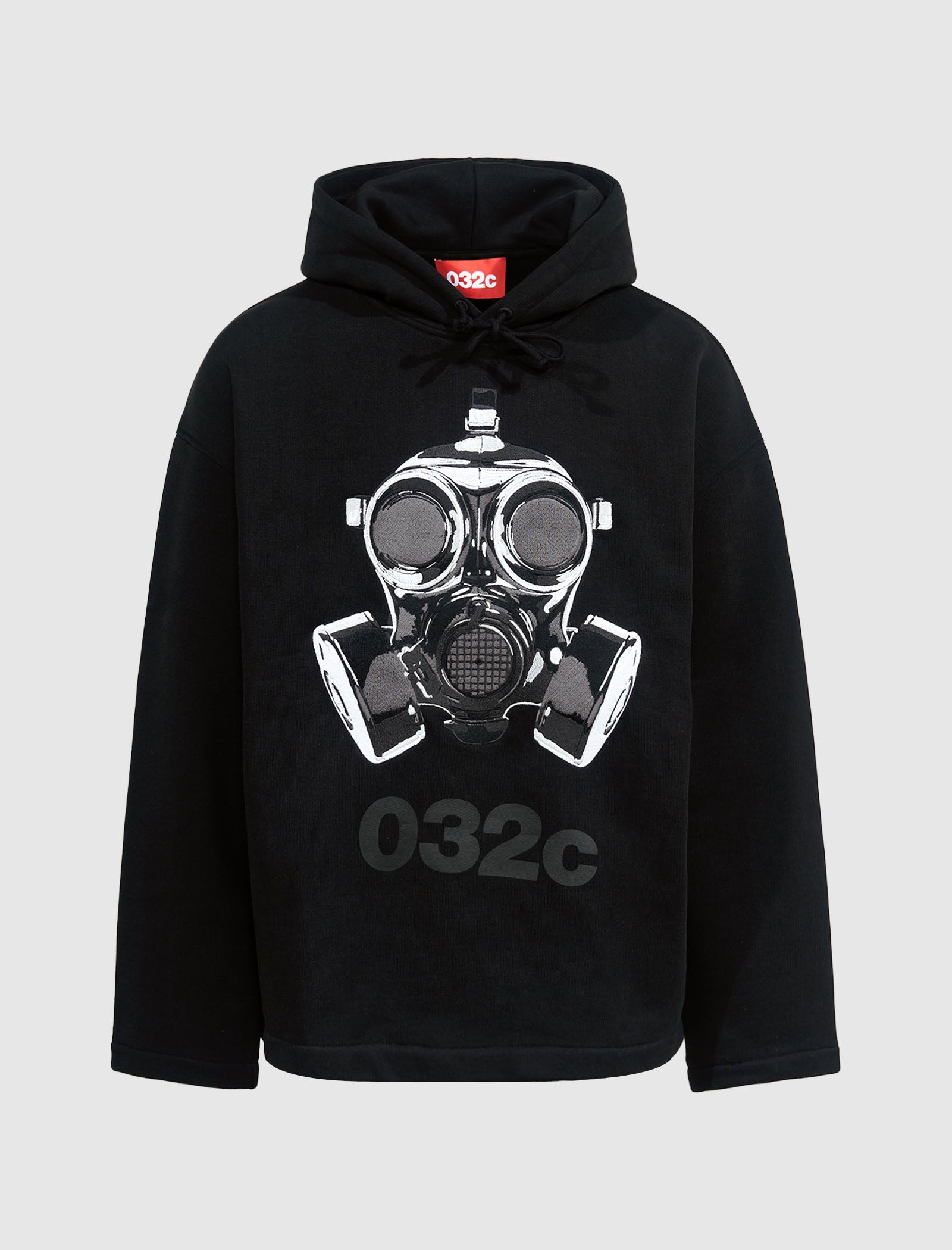 Oversize pullover hoodie. Adjustable drawstring hood. Oversize sleeves. Graphic logo text and mask print at front.