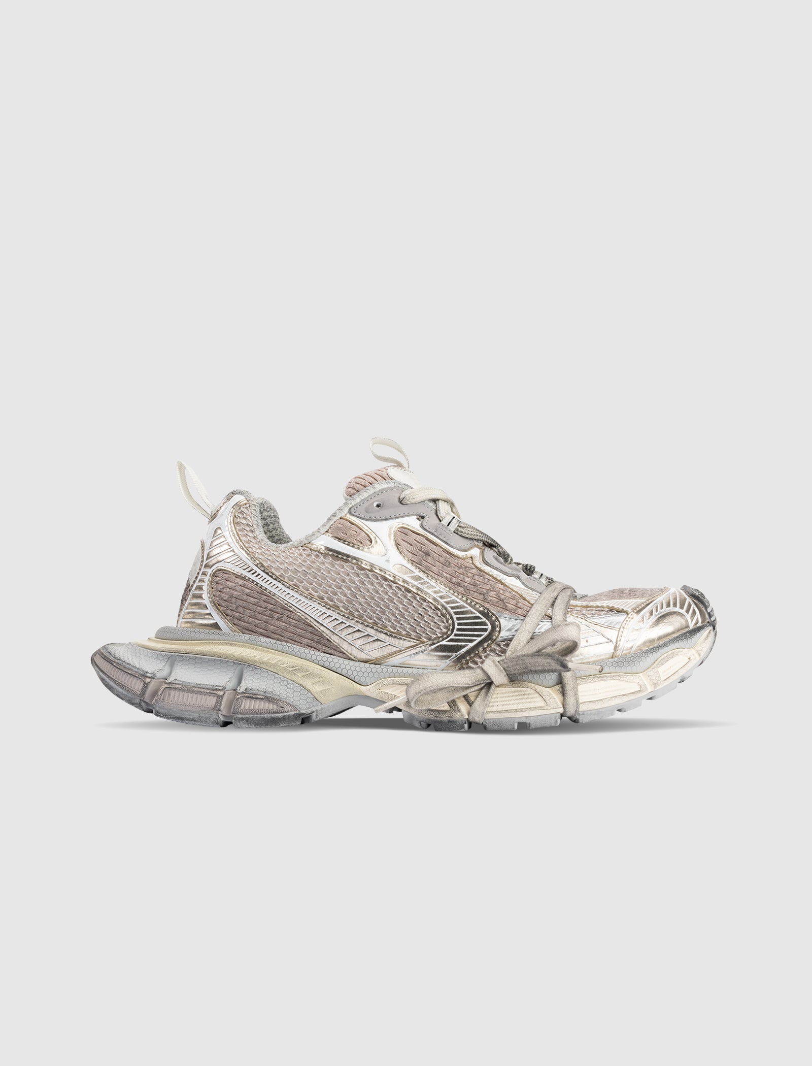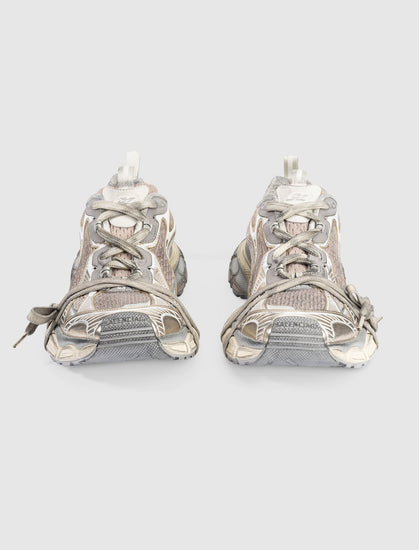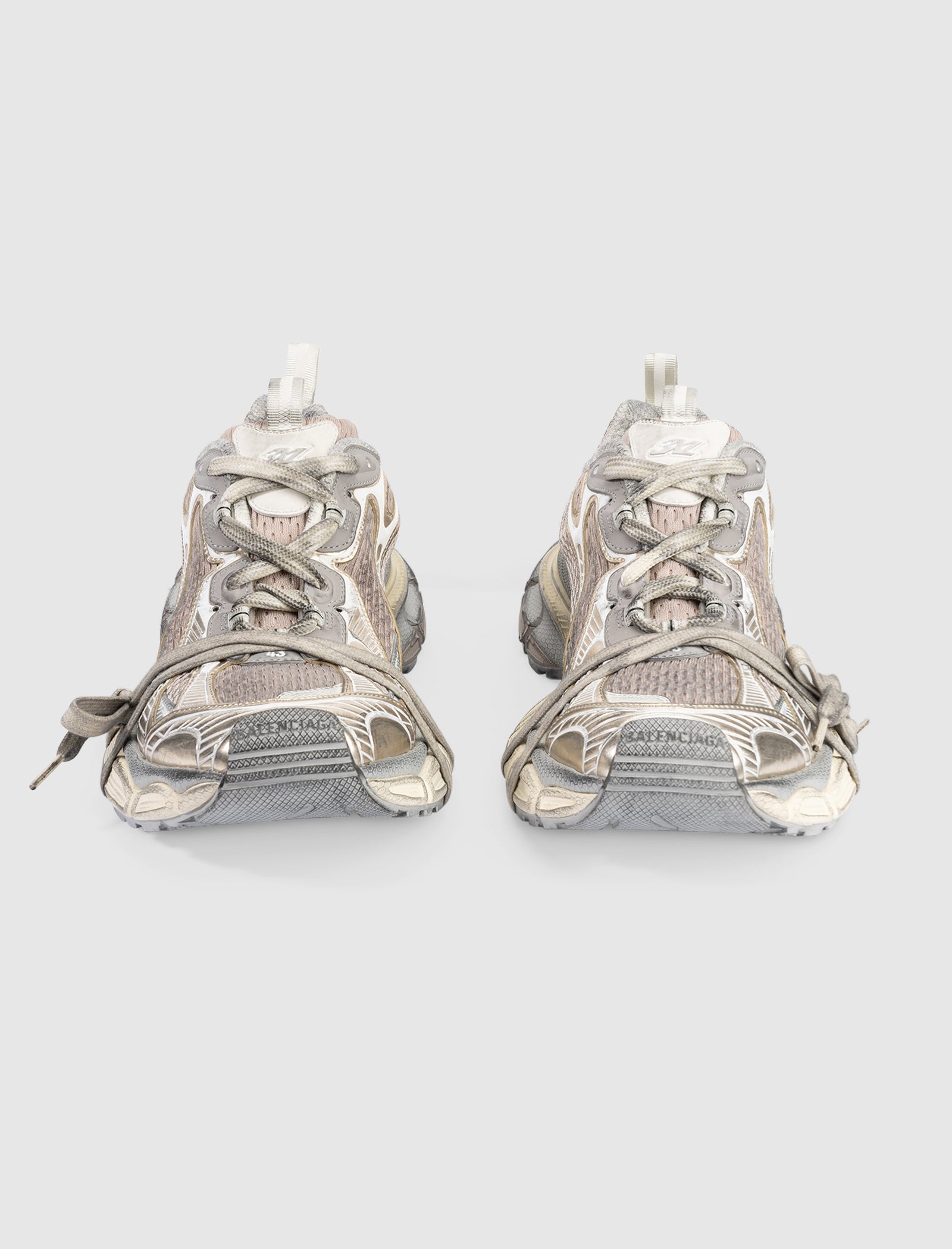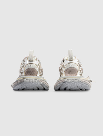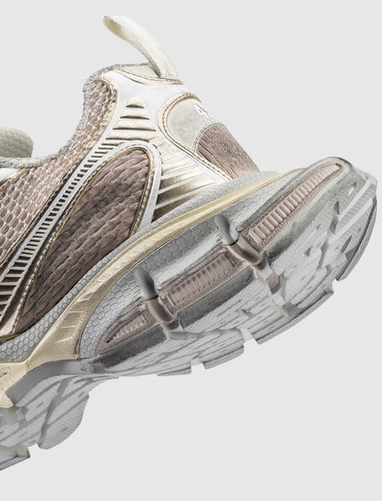 Low top sneaker. Layered mesh upper. Synthetic textile overlays around the toe, eyelet panels, side panels, and heel counter. Front lacing. Padded mesh tongue with embossed sizing. Nylon tape loop pulls at the back of the collar, and on the tongue. Platform EVA foam midsole with an extended heel. Rubber outsole. Worn-out effect all throughout.