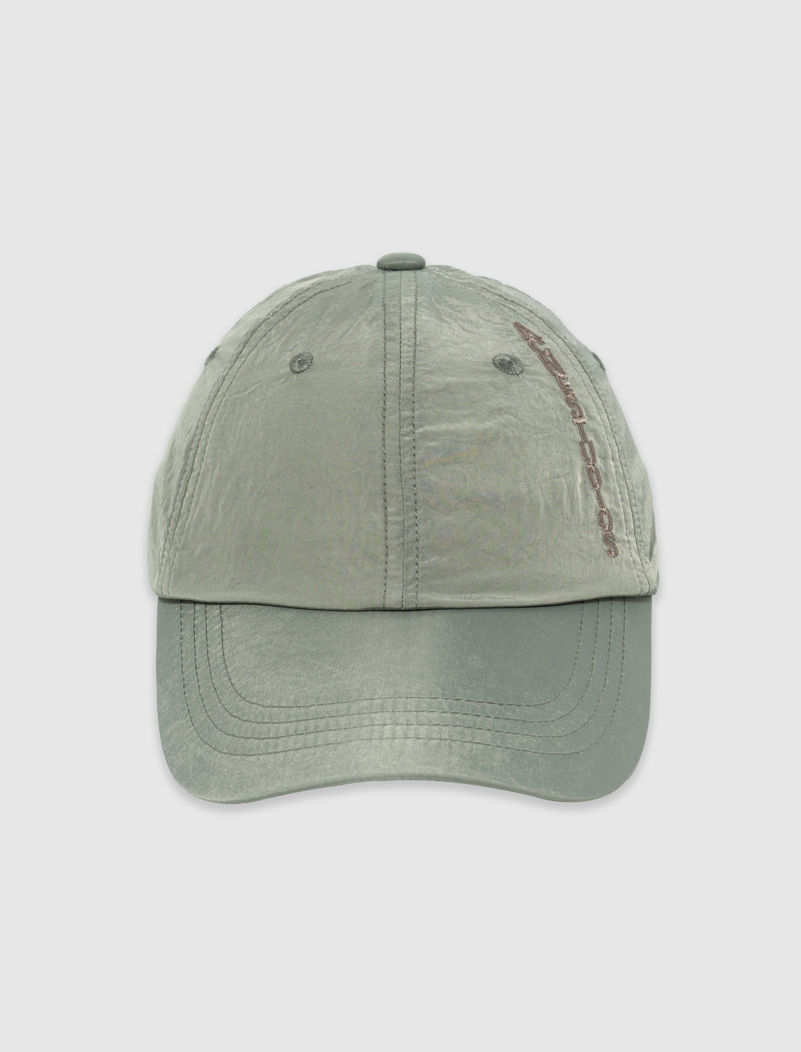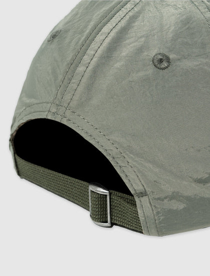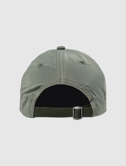 Nylon cap. Embroidered logo on the left side panel. Curved nylon brim. Nylon back strap. Metal buckle.
