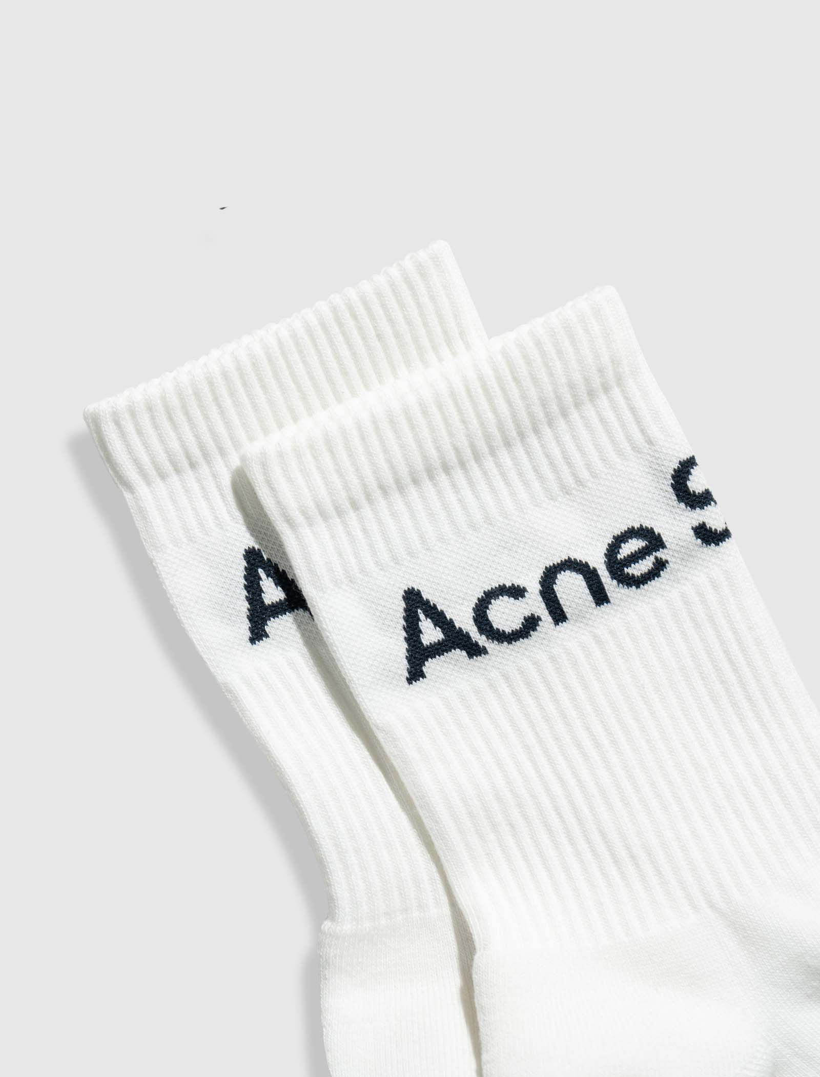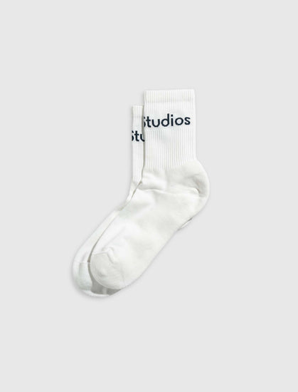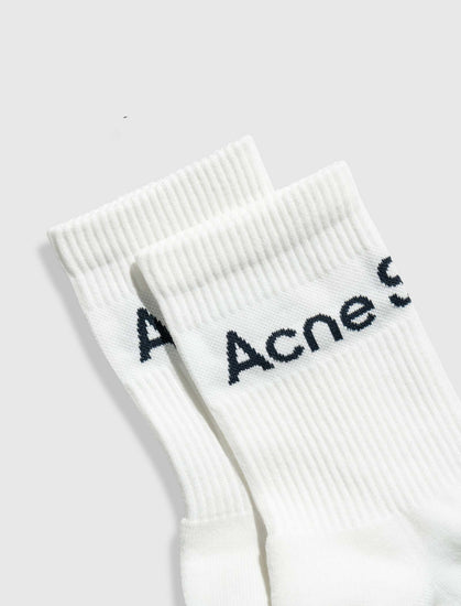 Ribbed crew socks. Intarsia knit logos on the sides. Calf-length.
