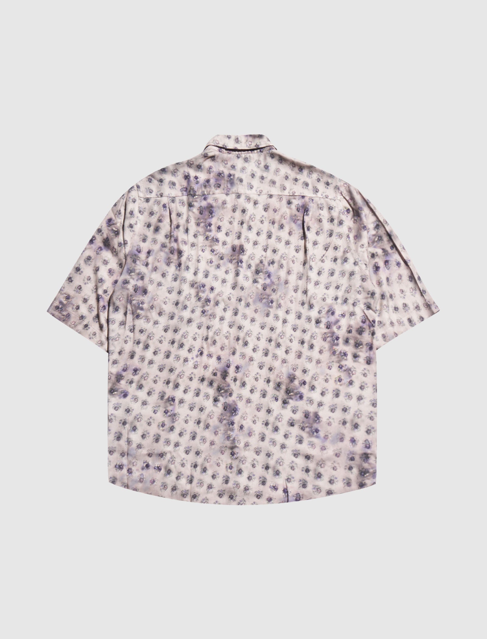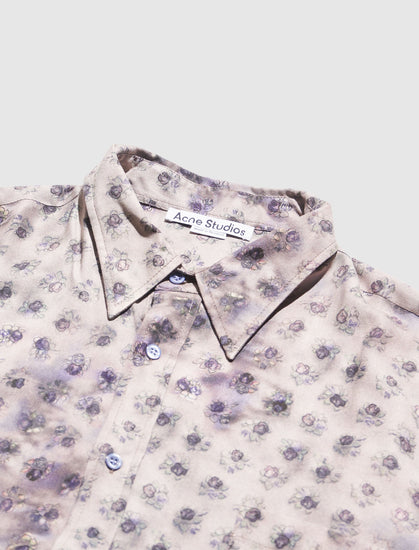 Short sleeve shirt. Pointed collar. Single pocket at chest. Floral print throughout. Button closures at front.
