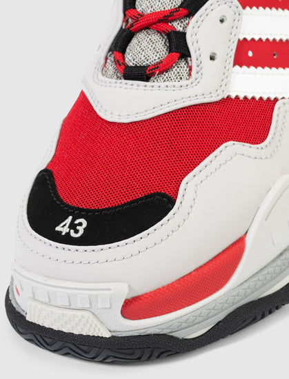 Low top sneakers. Synthetic mesh upper. Synthetic leather overlays around the toe, on the eyelet panels, and lower side panels, and heel counter. Stripe patches stitched on the side panels. Front lacing. Embroidered logo on the side panels, and on the toe. Stamped logo on the synthetic leather tongue, and heel. Stacked three-layer foam midsole. Rubber outsole.