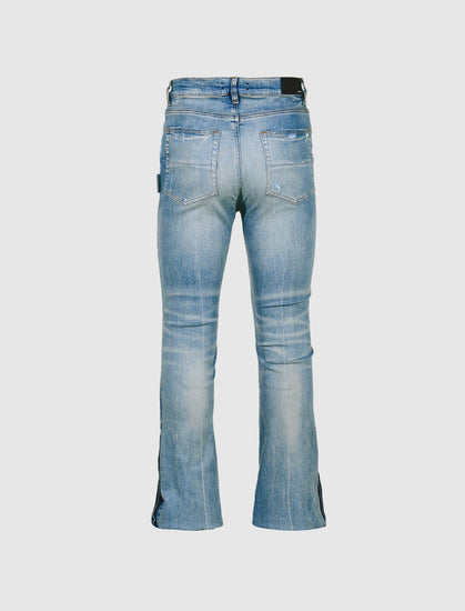 Light wash denim flared jeans. Five-pockets. Distressed detail at front. Fading throughout. Button-fly closure at front.