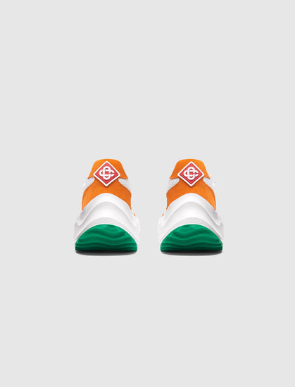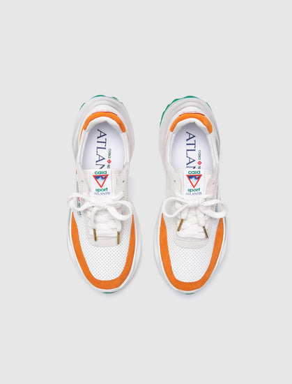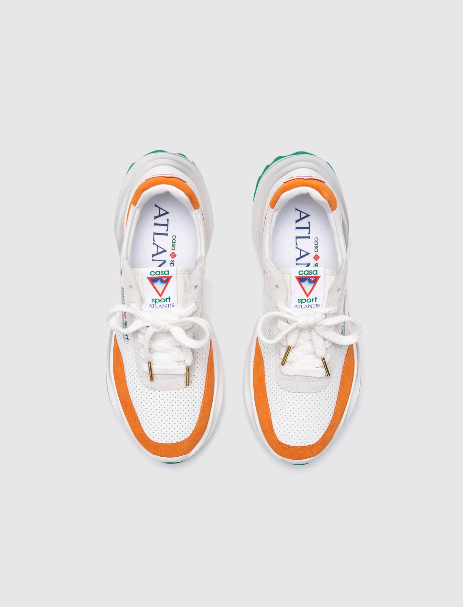 Low top sneakers. Perforated leather upper. Suede overlays around the toe, eyelet panels, and heel counter. Leather tongue. Front lacing with gold-tone metal aglets. Rubberized logo patch at the heel. EVA foam midsole. Rubber outsole.