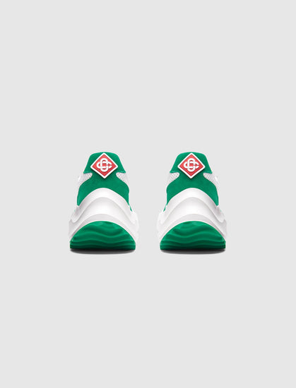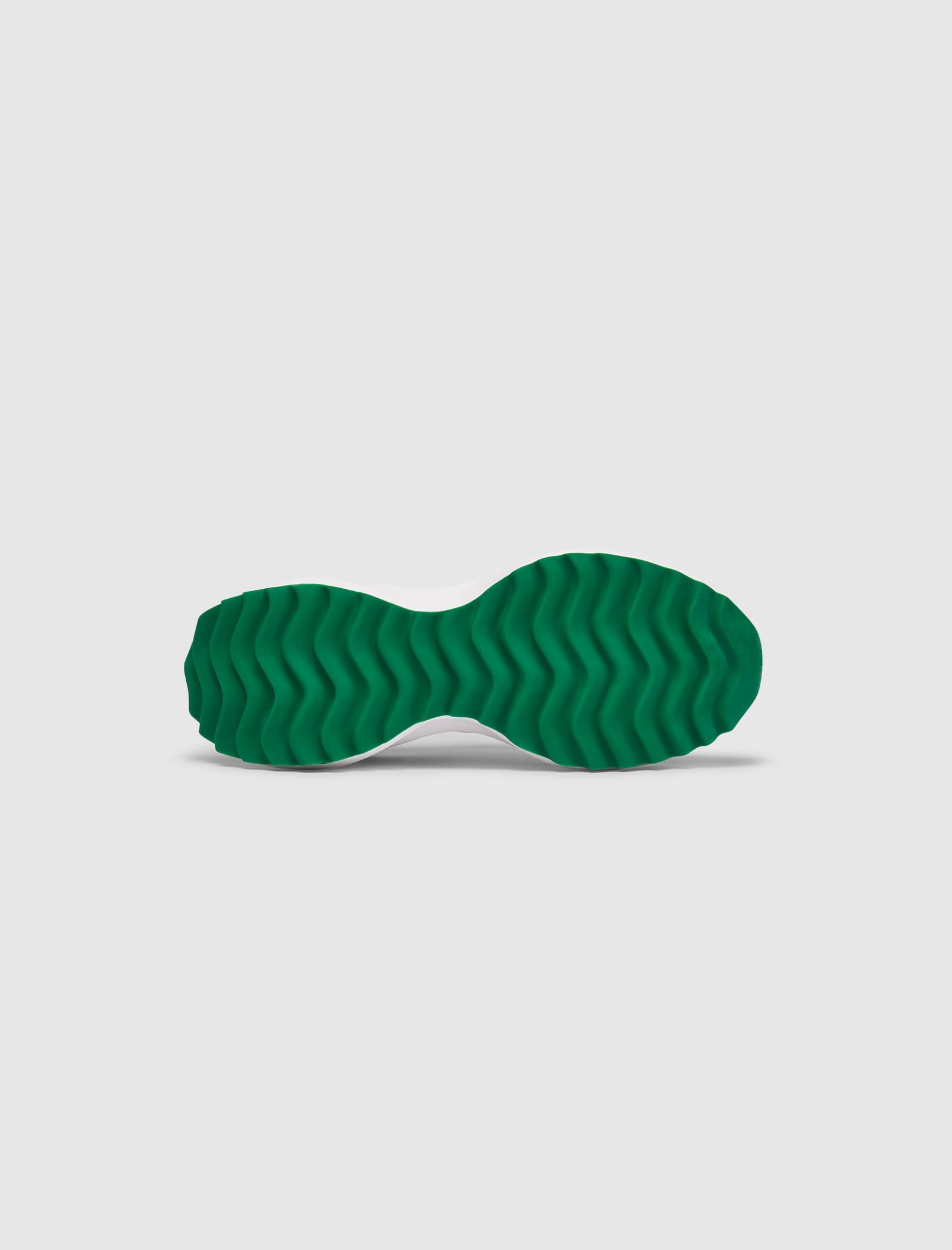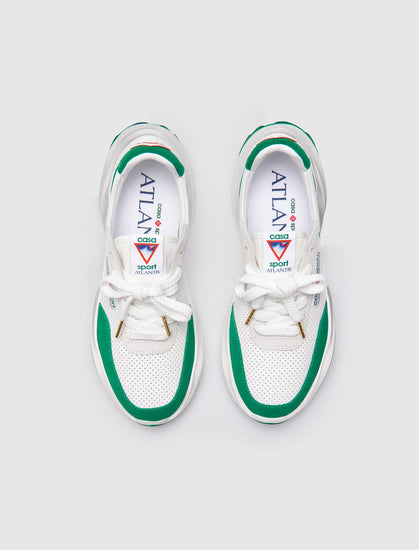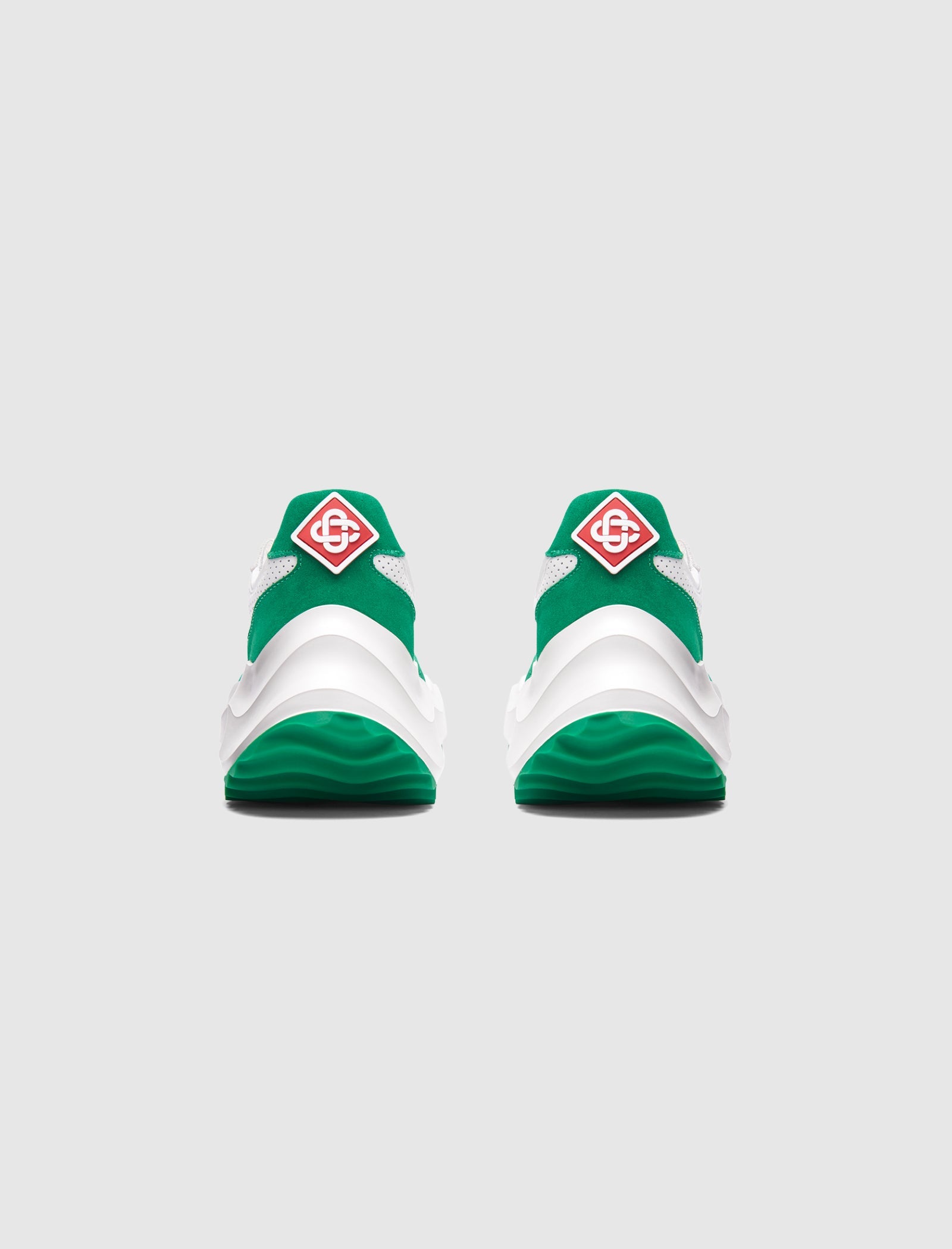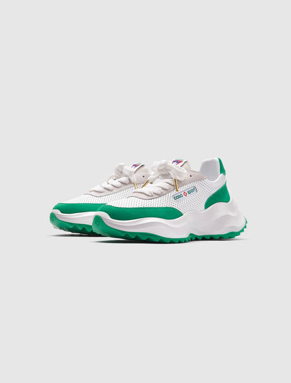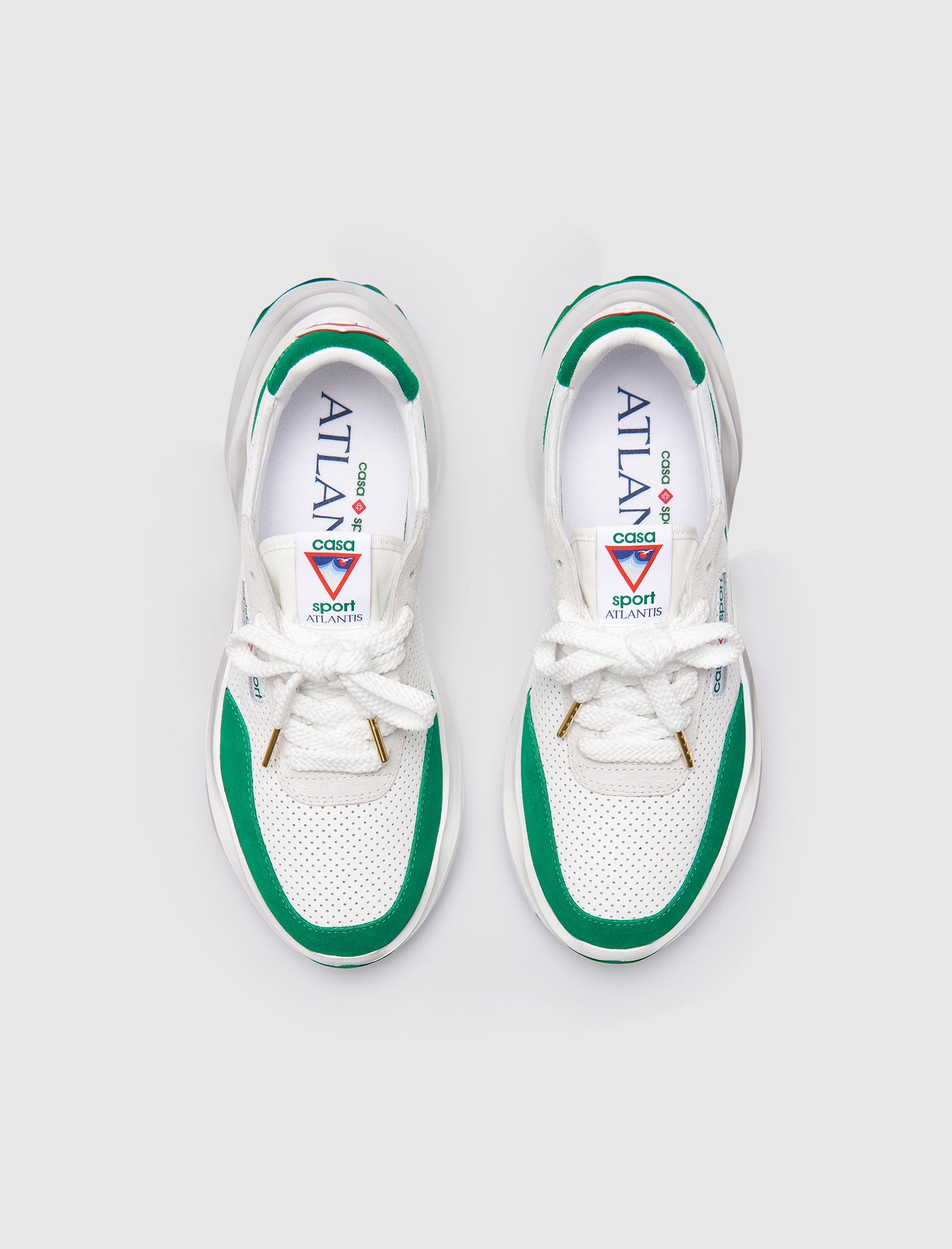 Low top sneakers. Perforated leather upper. Suede overlays around the toe, eyelet panels, and heel counter. Leather tongue. Front lacing with gold-tone metal aglets. Rubberized logo patch at the heel. EVA foam midsole. Rubber outsole.