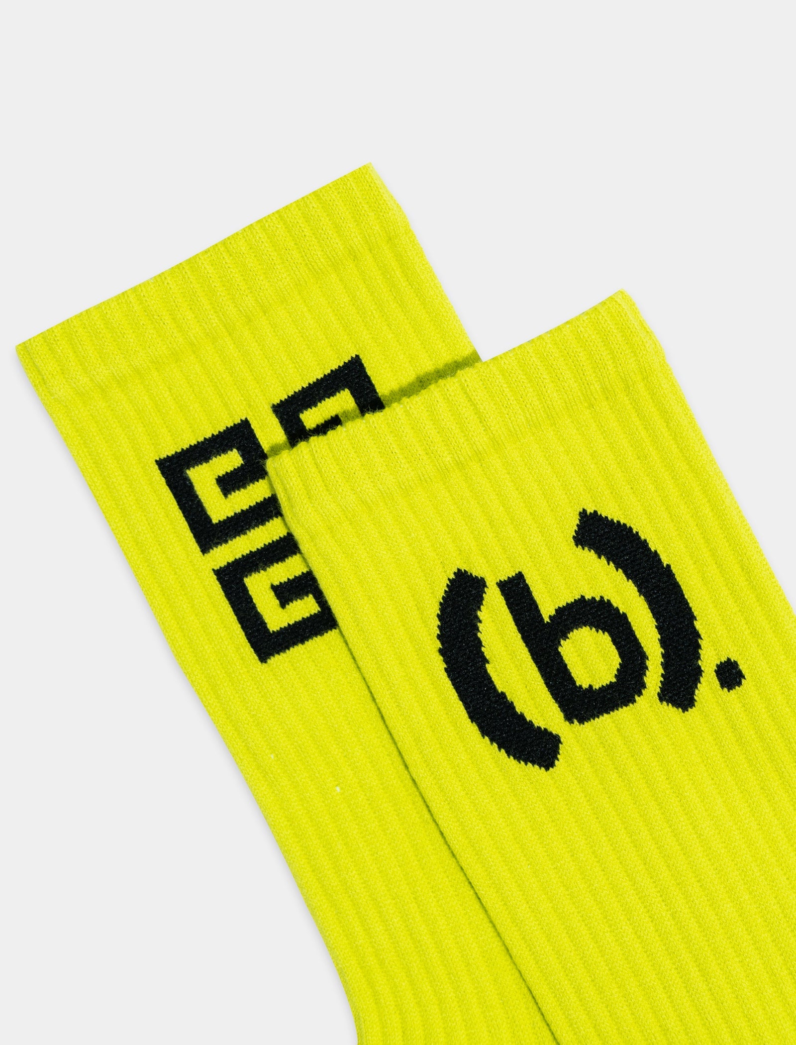 Ribbed crew socks. Jacquard knit logos on the sides of the collar. Calf-length.