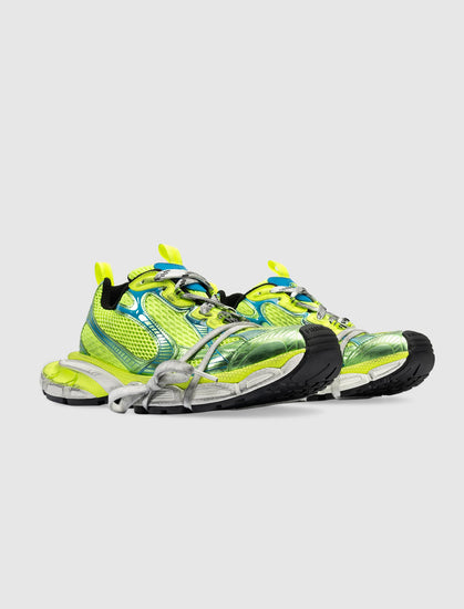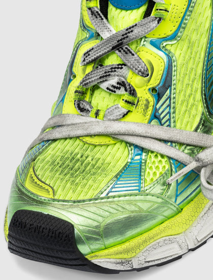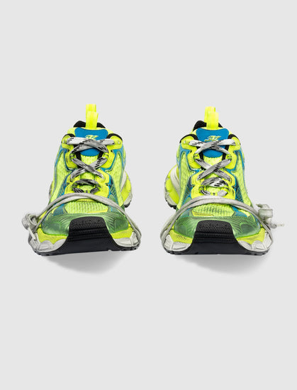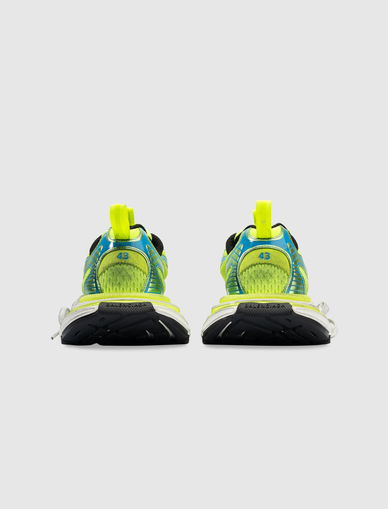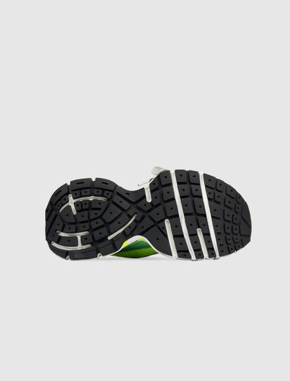 Low top sneaker. Layered mesh upper. Synthetic textile overlays around the toe, eyelet panels, side panels, and heel counter. Front lacing. Padded mesh tongue with embossed sizing. Nylon tape loop pulls at the back of the collar, and on the tongue. Platform EVA foam midsole with an extended heel. Rubber outsole. Worn-out effect all throughout.