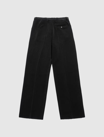 Large-fit straight leg tailored pants. Four pockets. Button and zip-fly closures at front.