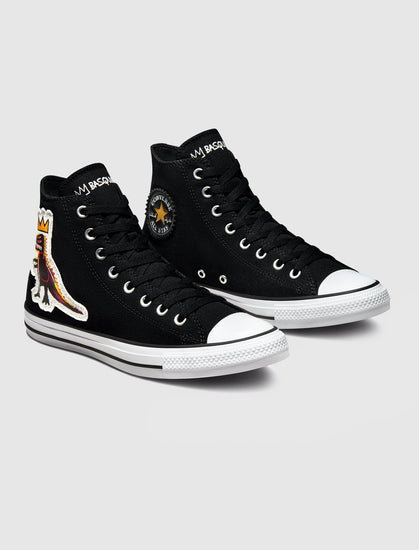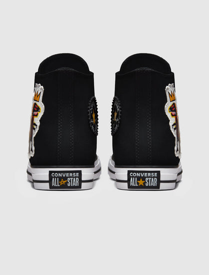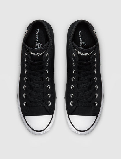 High top sneaker. Canvas upper. Rubber toe cap. Stitched canvas patches on the side panels. Patch stitched on the inner ankle. Graphic sock-liner. Rubber midsole with a rubber patch on the heel. Rubber outsole.