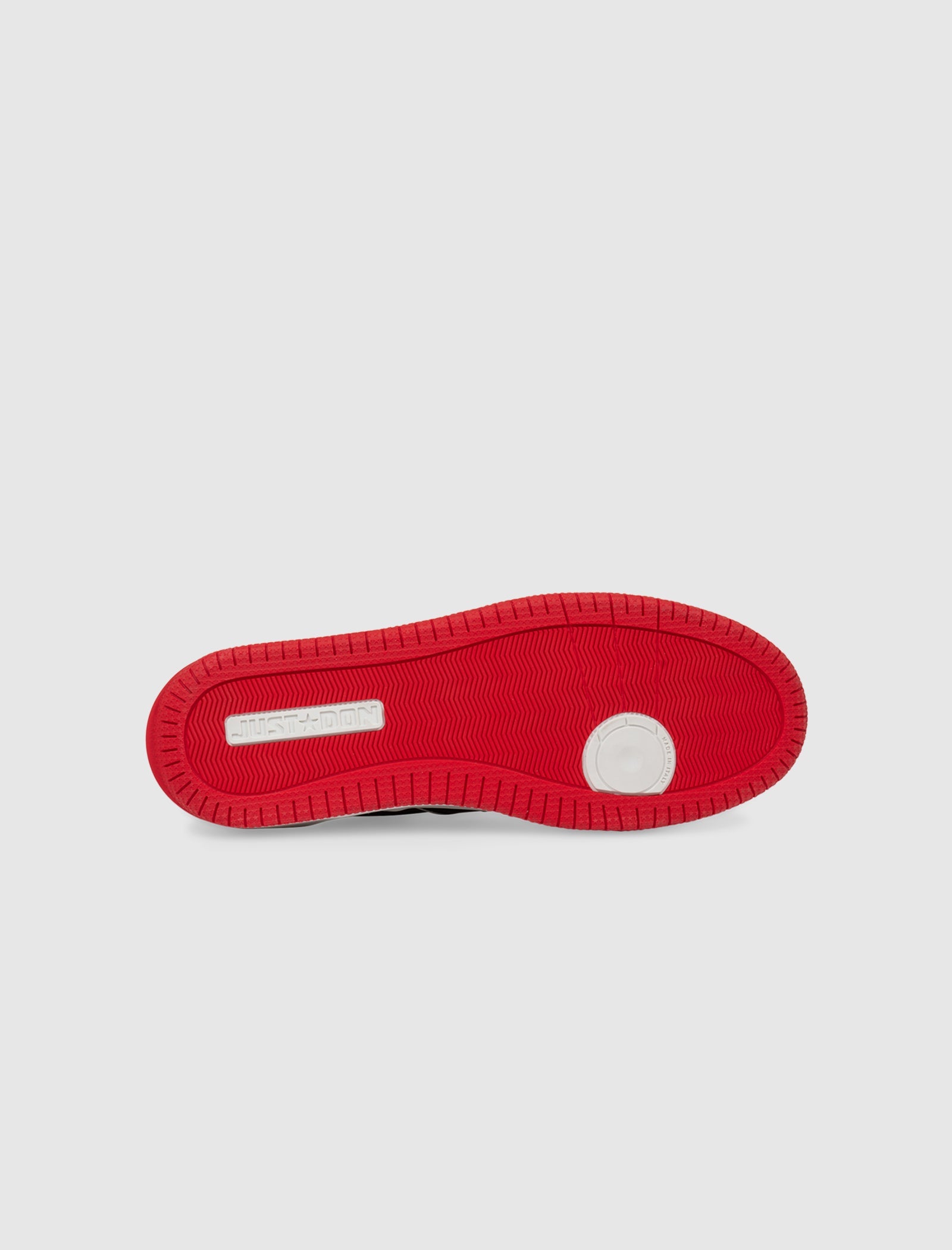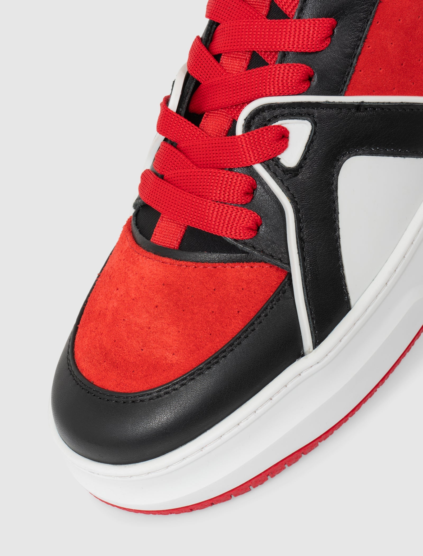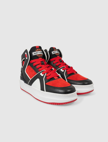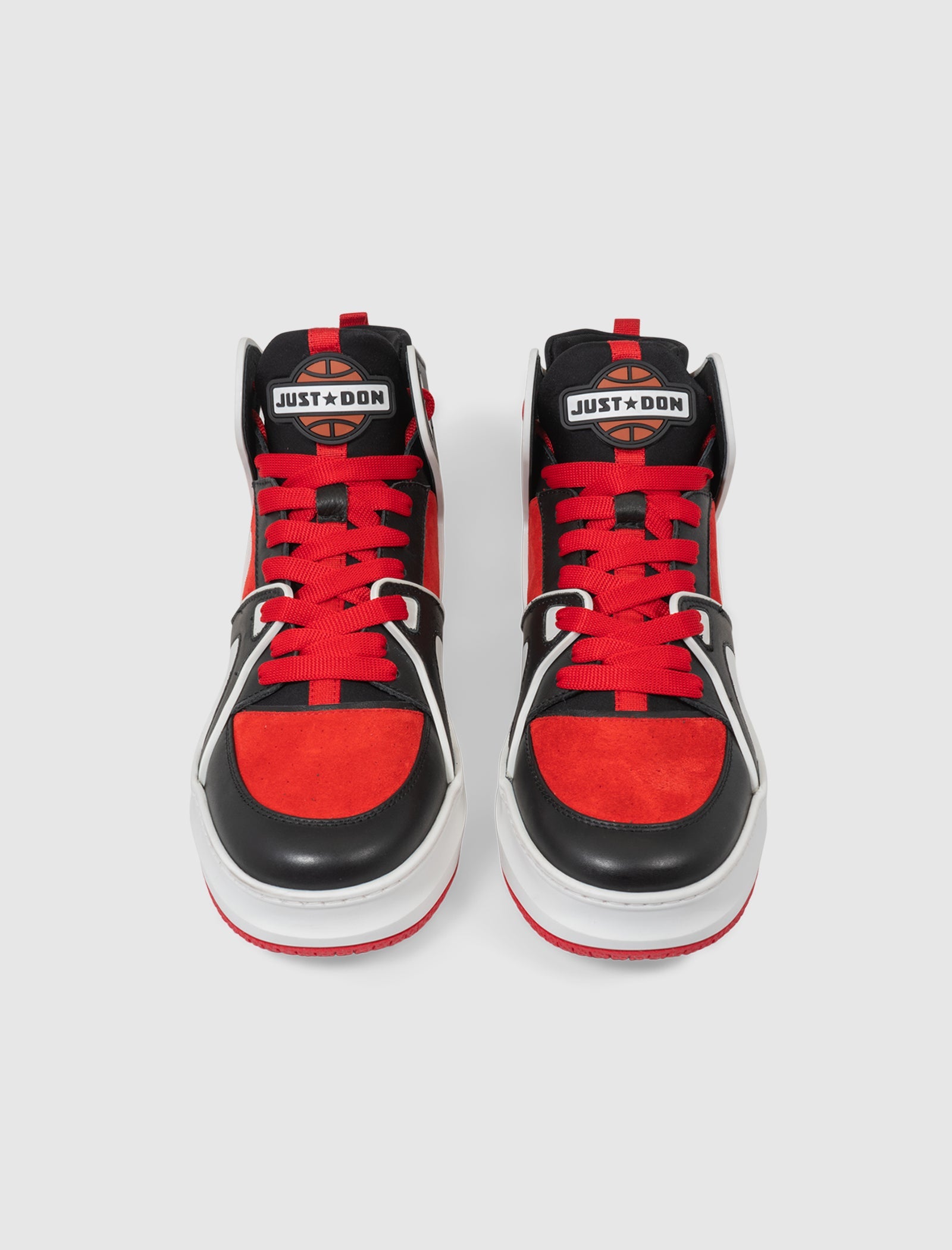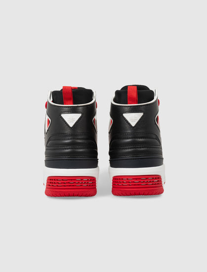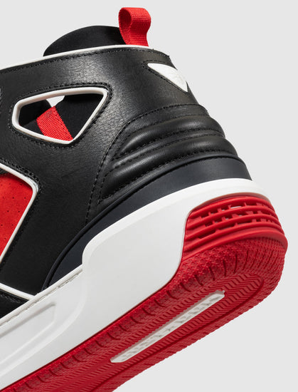 High top sneaker. Perforated suede toe box, and side panels. Stitched leather overlays around the toe and heel. Front polyester lacing. Rubberized logo on the tongue. Nylon tongue. TPU cage inserts on the upper with leather panels stitched on top. Neoprene sock. Molded rubber midsole and outsole.