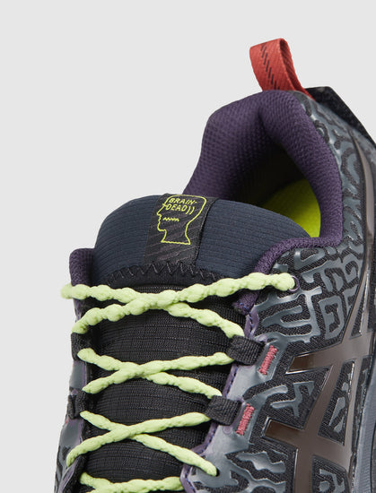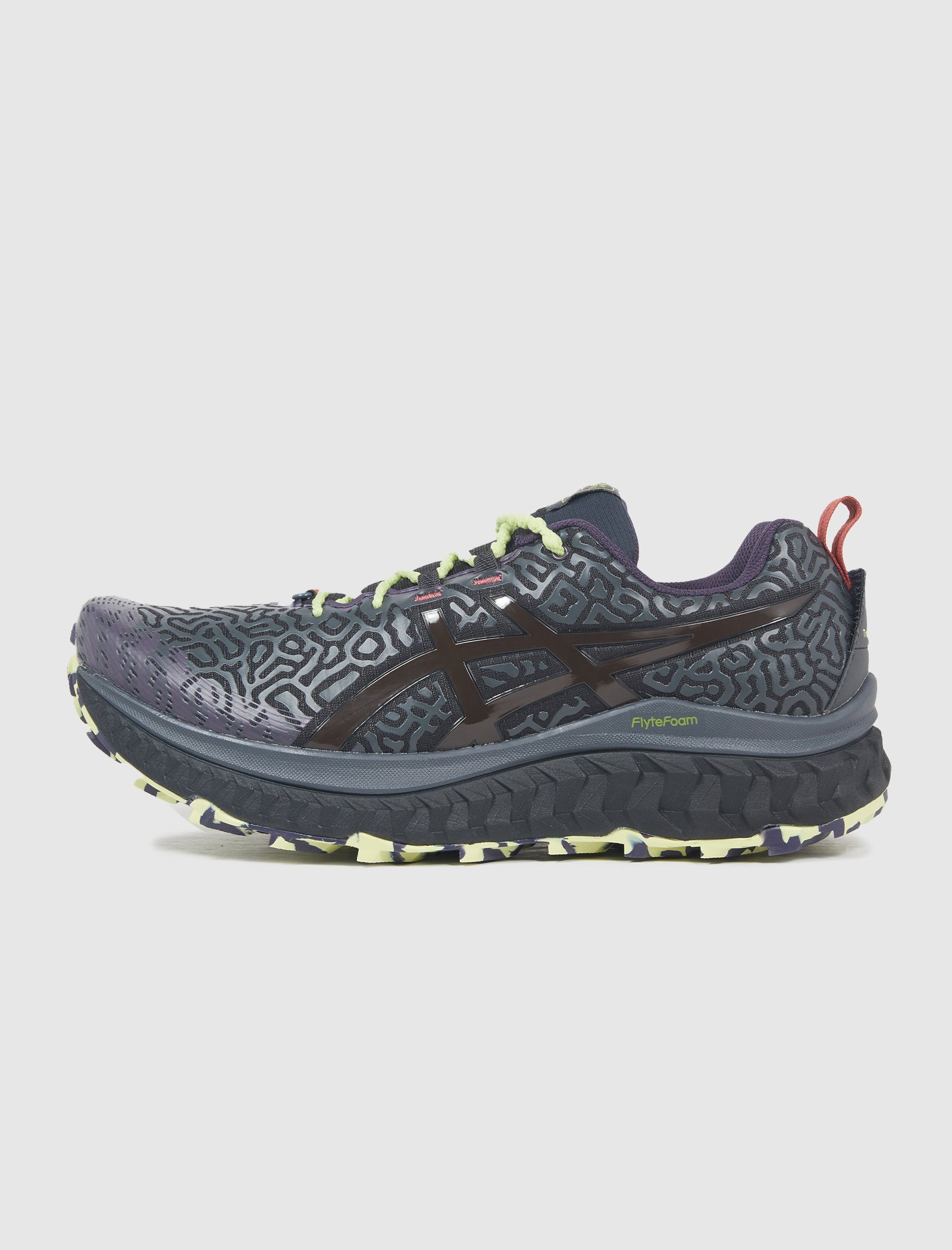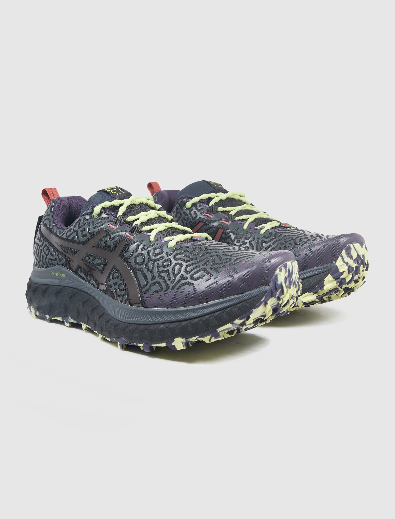 Low top sneaker. Mesh upper. 3D printed texture all throughout the upper. Logo on the side panels. Front lacing. Flytefoam cushioning on the midsole. ASICSGRIP Rubber outsole.