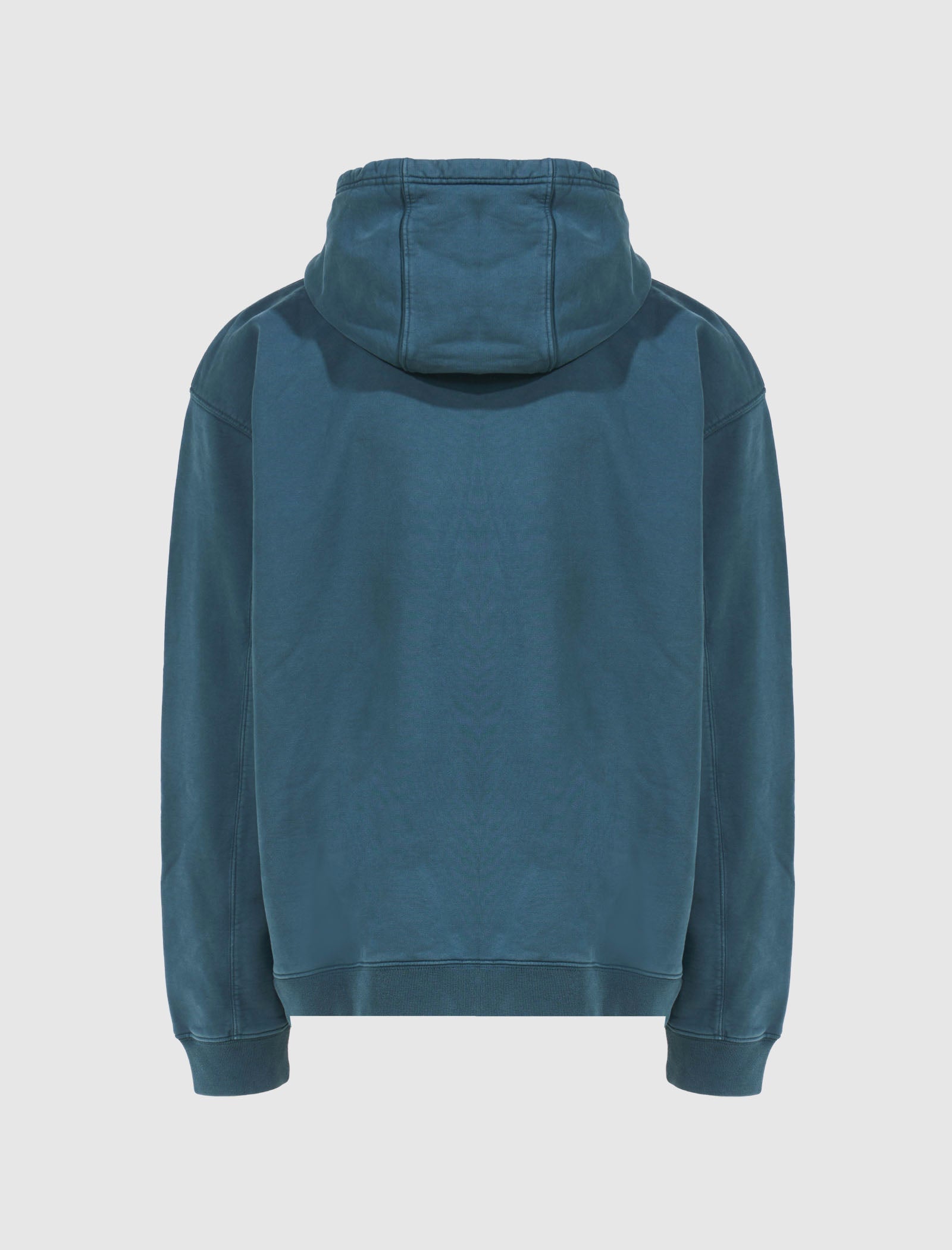 Pullover cotton hoodie. Fixed hood. Graphic logo text and print at chest. Kangaroo pocket at front. Ribbed cuffs and hem.
