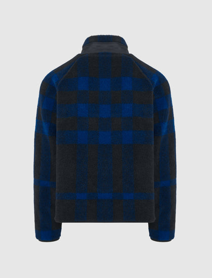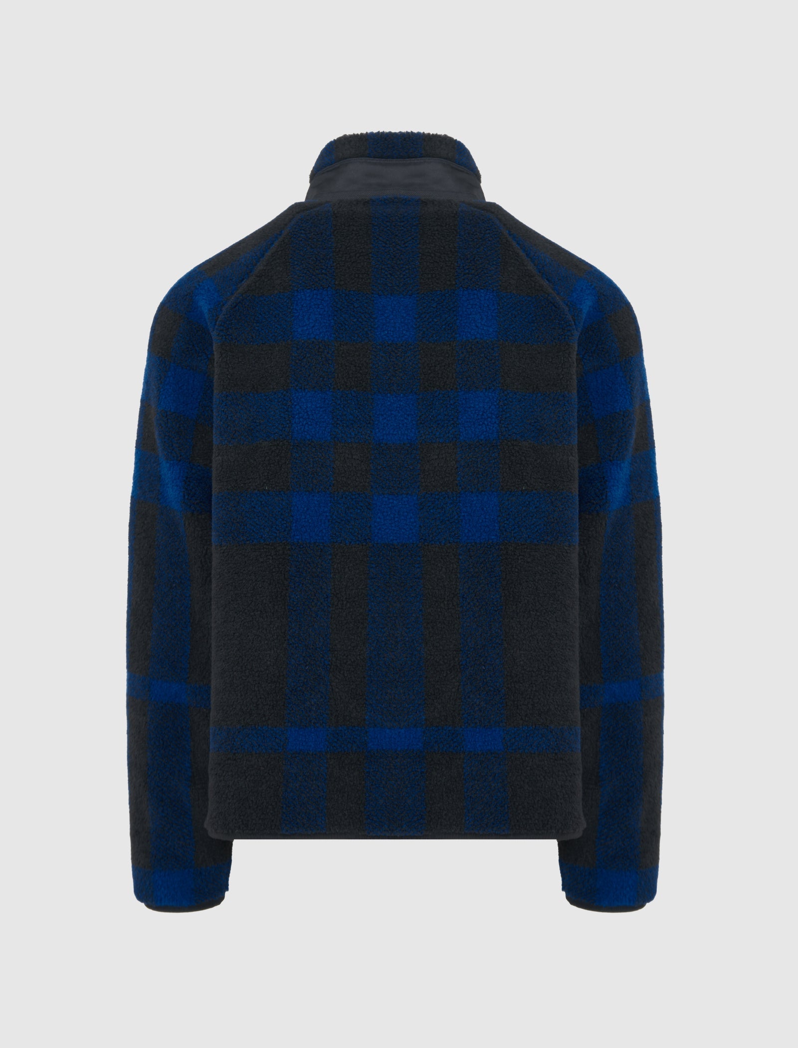 Wool-blend fleece jacket. High-neck. Single zip pocket at chest. Two pockets at sides. Exploded plaid pattern throughout. Zip closure at front.