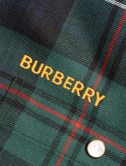 Woven wool overshirt. Tartan check print all throughout. Front patch pocket at left chest with an embroidered logo on top and a press stud fastening. Buttoned wrist cuffs. Leather elbow patches. Diamond quilted inner liner. Press stud buttoned collar. Curved hem.