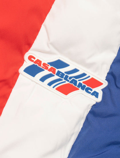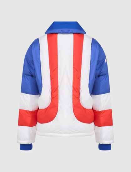 Nylon puffer jacket. Ribbed stand collar and cuffs. Two concealed zip pockets at sides. Logo text patch at chest. Zip closure at front.
