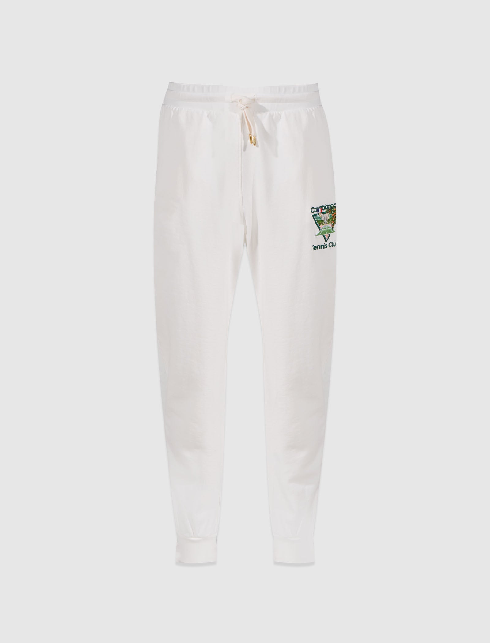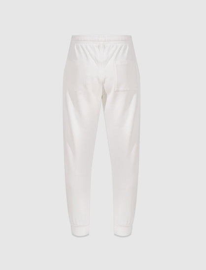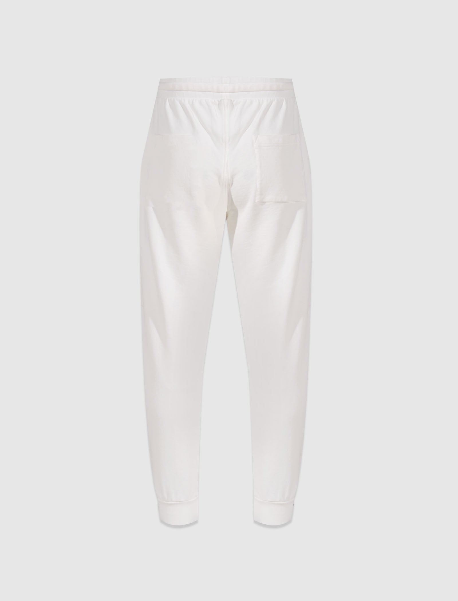 Cotton sweatpants. Adjustable drawstring waistband. Two pockets at sides. Single patch pocket at back. Embroidered logo text and print at side.