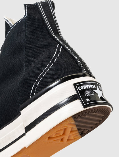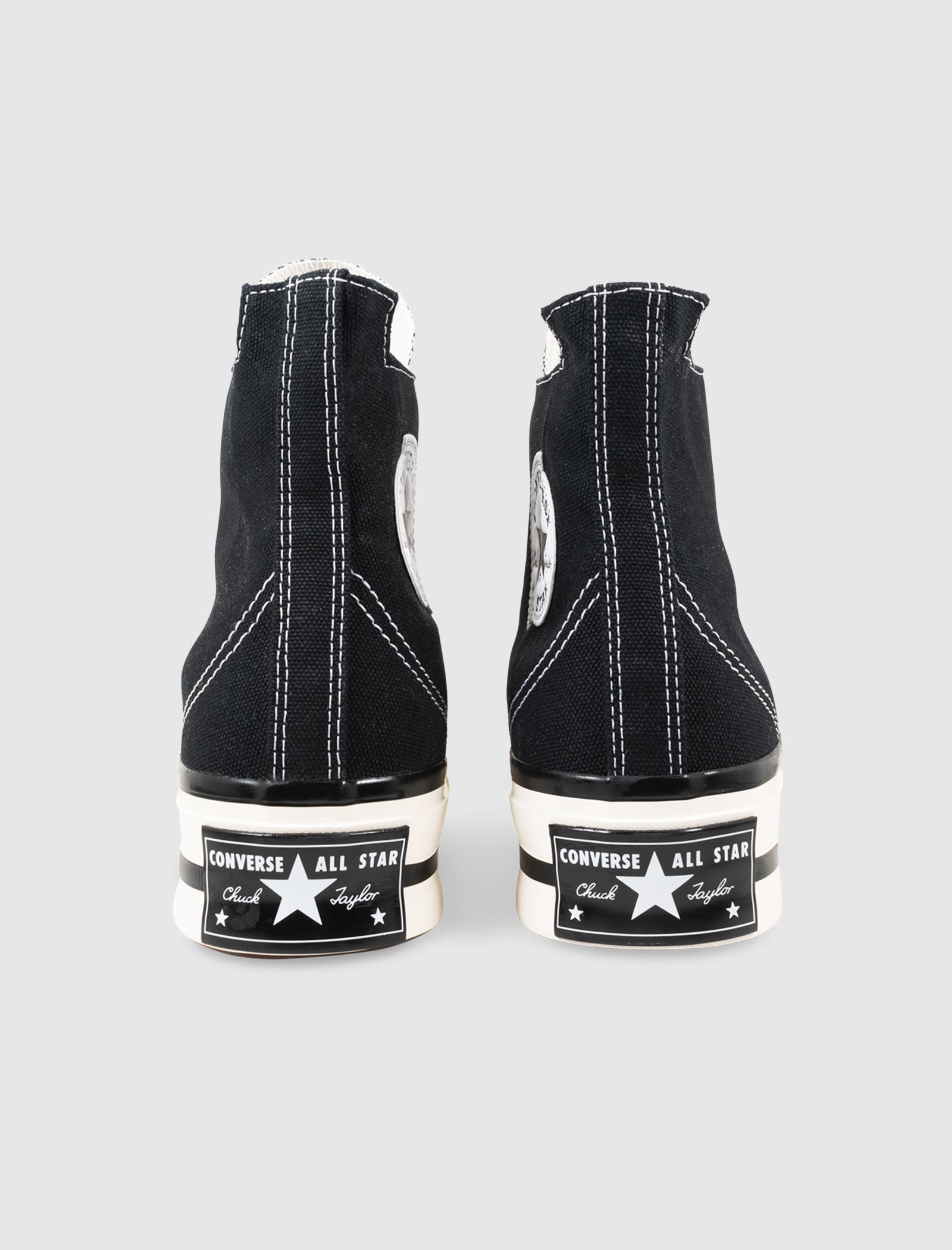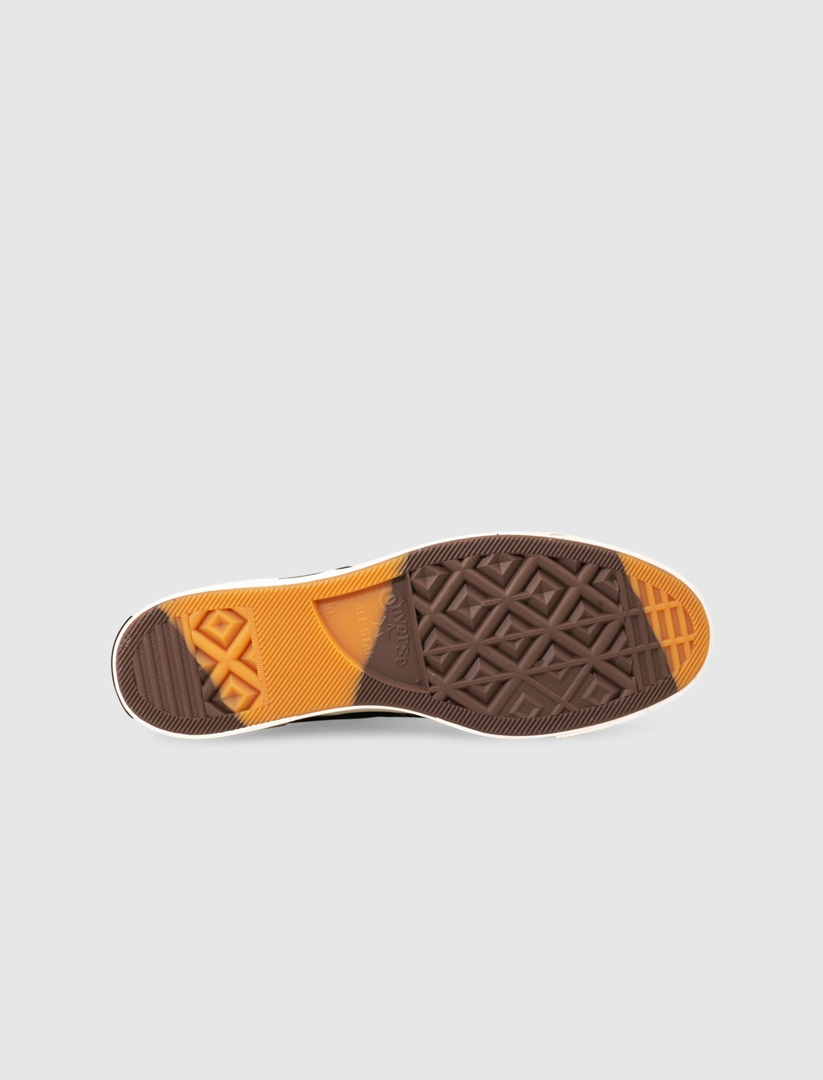 High top sneakers. Rubber toe cap. Patchwork canvas upper. Aluminum eyelets. Front lacing. Canvas tongue. Jagged rubber midsole. Rubber logo patch on the heel. Rubber outsole.