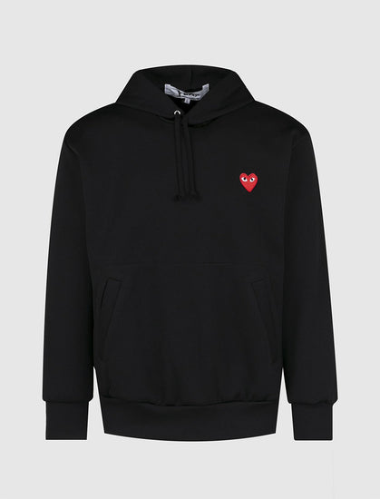 This Comme Des Garçons Play pullover hoodie features a classic black jersey with comfortable ribbed trim and the brand’s iconic heart logo on the chest for a stylish, timeless look.