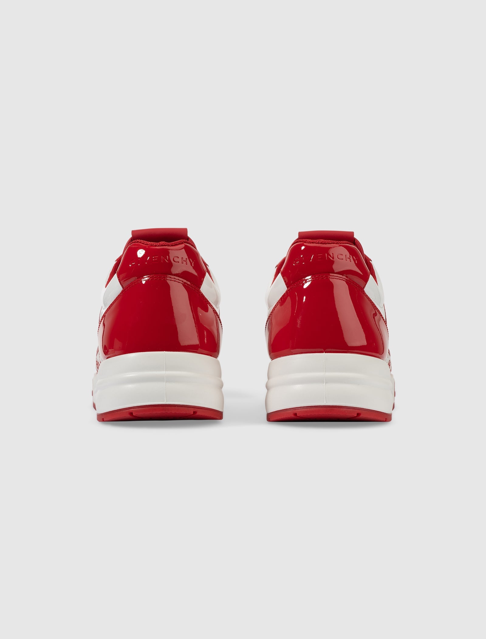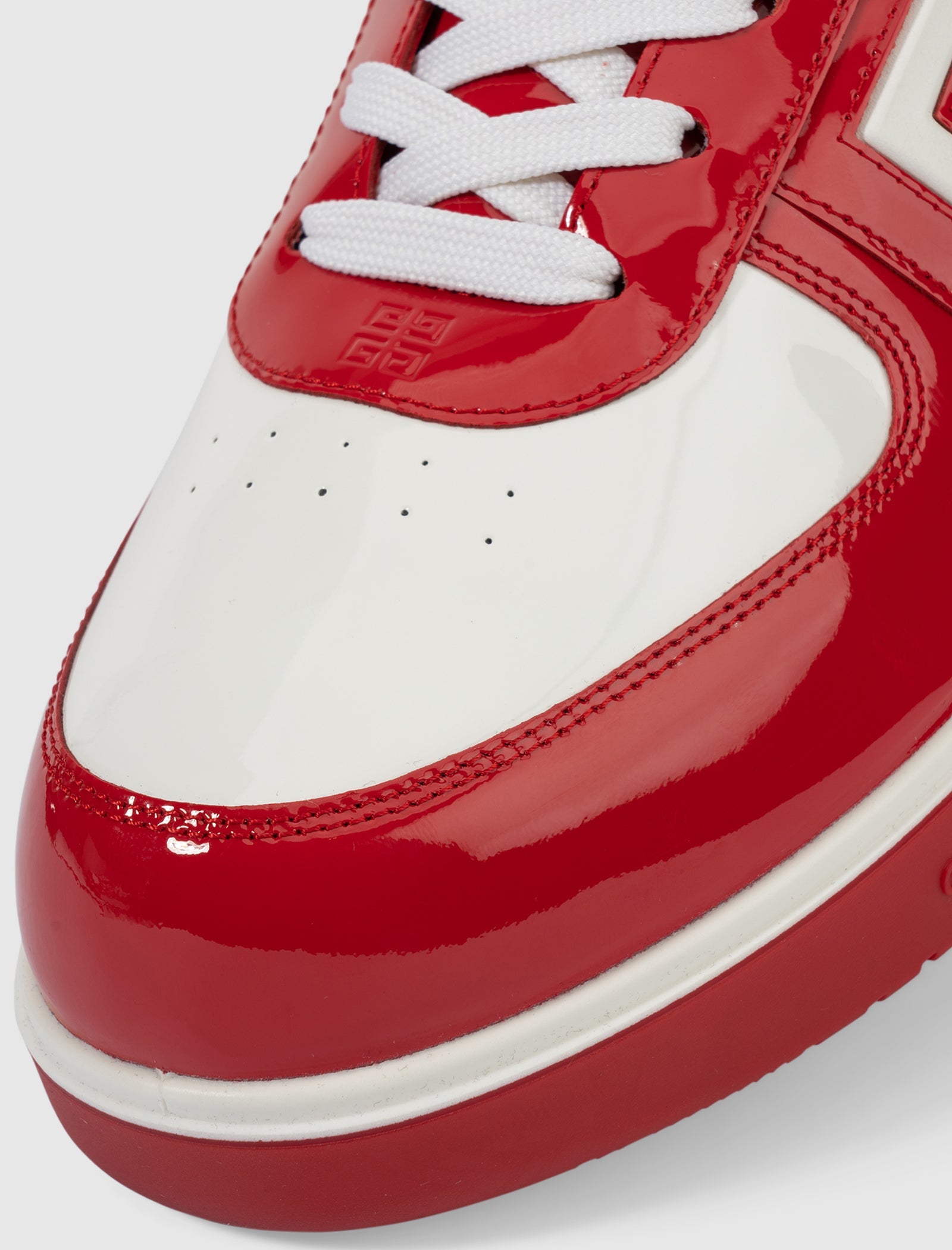 Low top sneakers. Leather upper. Patent leather overlay around the toe, side panels, and heel counter. Perforated side panels. 4G logo on the side panels. Leather tongue. Front lacing. Rubber midsole. Rubber outsole.