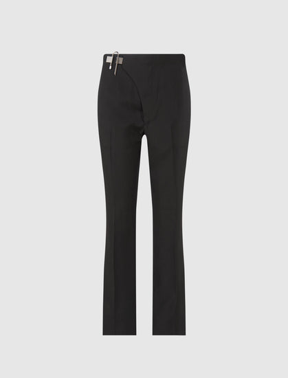 Wool slim-fit pants. Silver-tone U-lock buckle at waistband. Two pockets at sides. Two pockets at back. Cutout at front. Zip-fly closure at front.