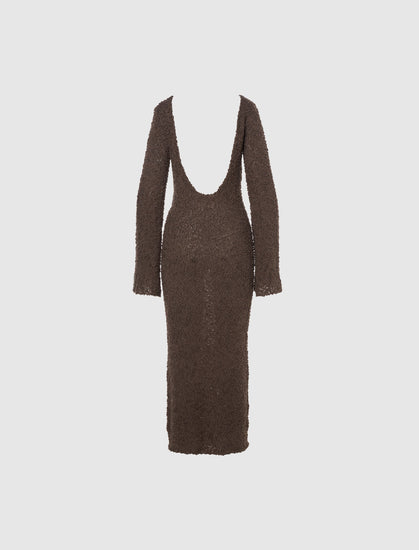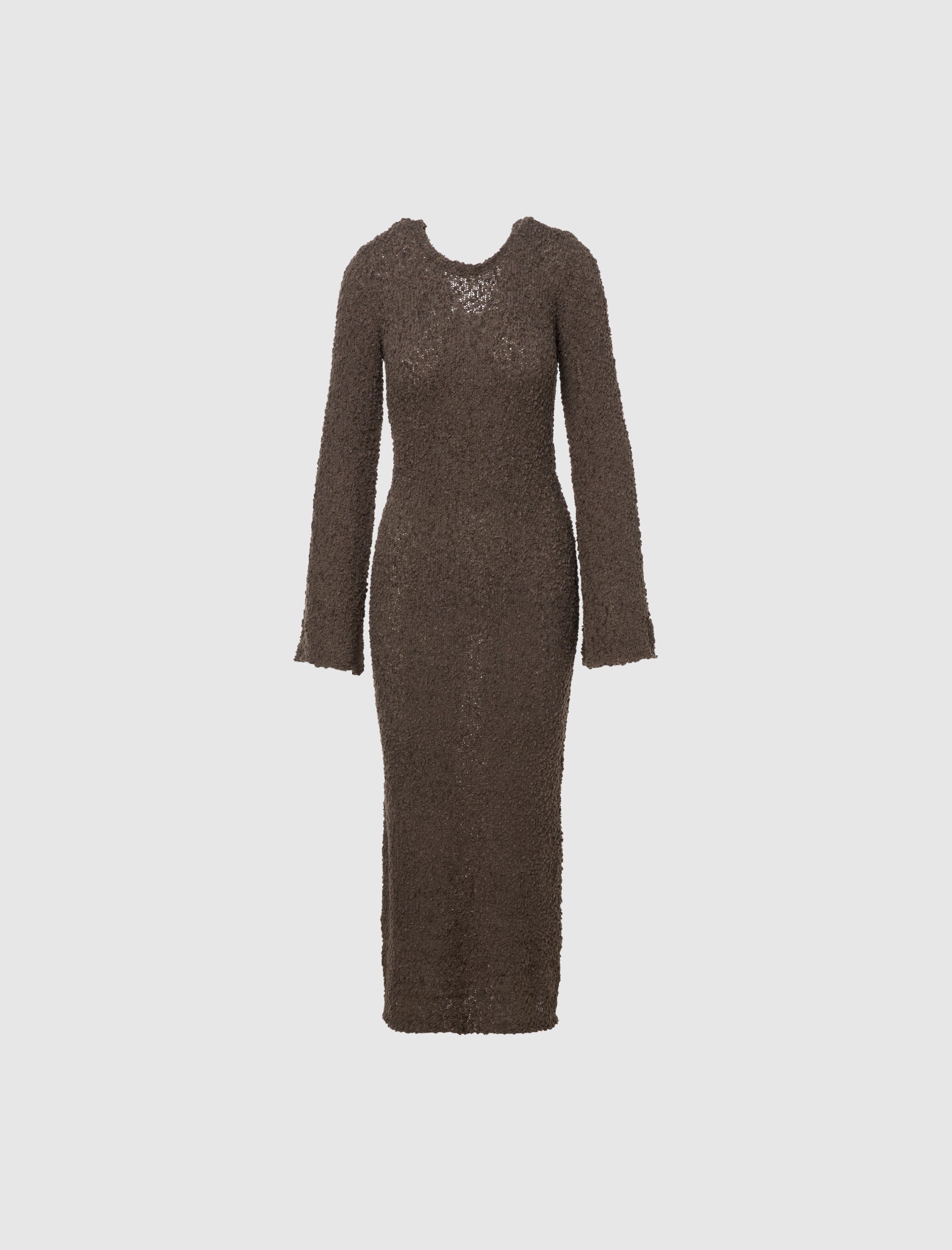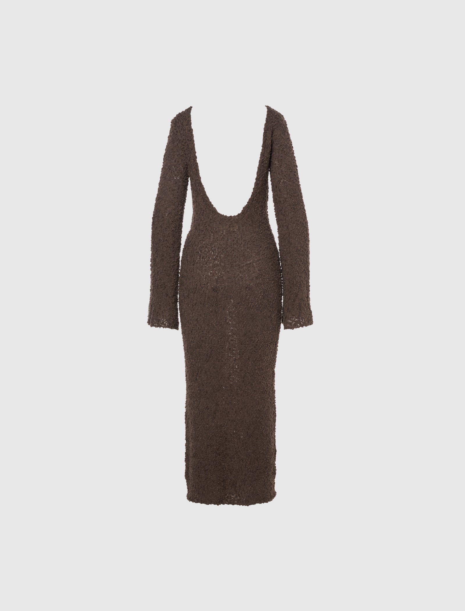 Tight-fit cotton knit maxi dress. Crewneck. Bell sleeves. Woven brand label at back. Exposed back featuring tie closure.