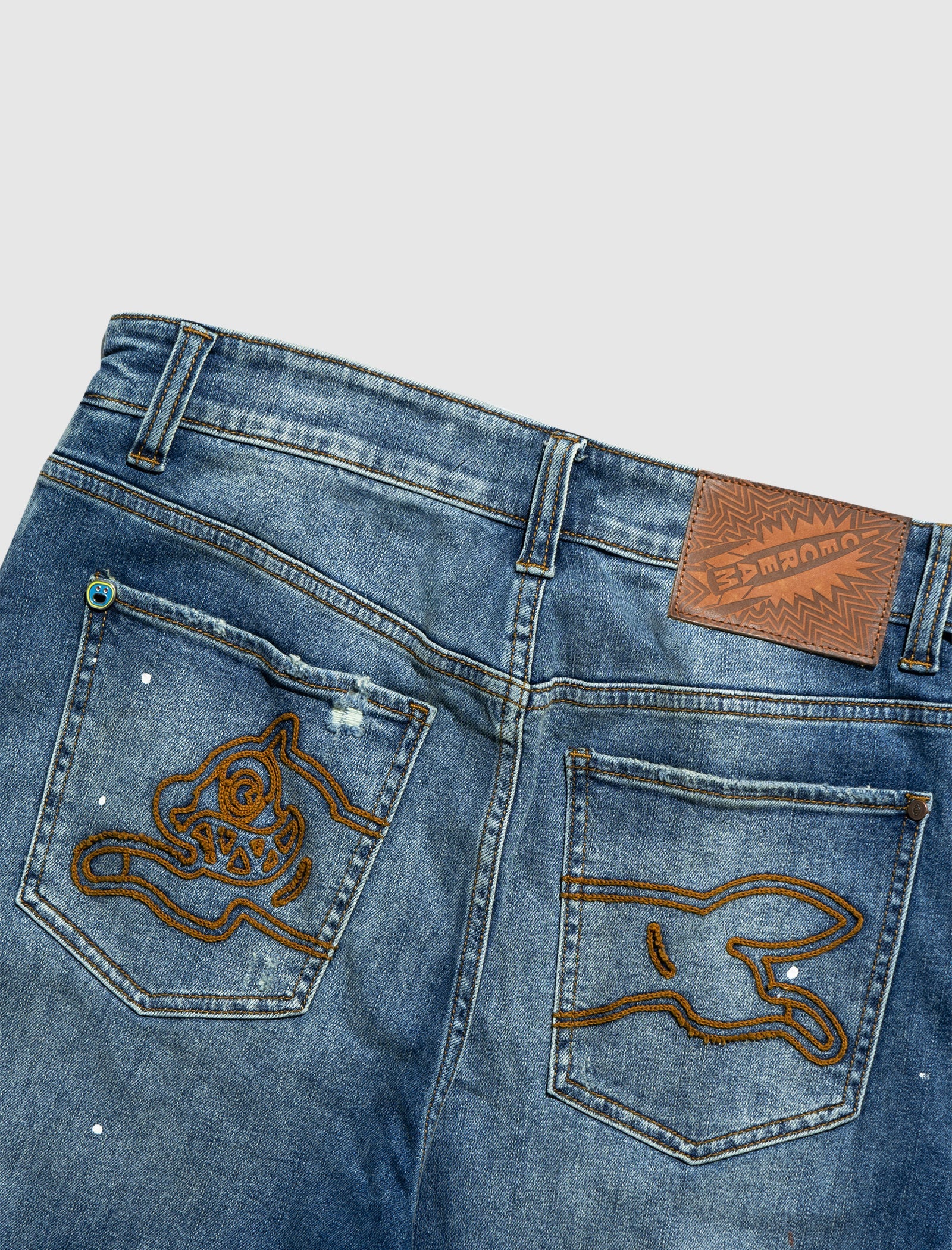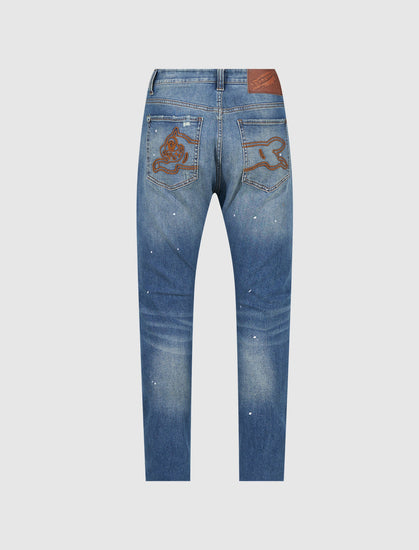 Dark-wash denim jeans. Five-pockets. Embroidered logo print at back. Distressing at front.
