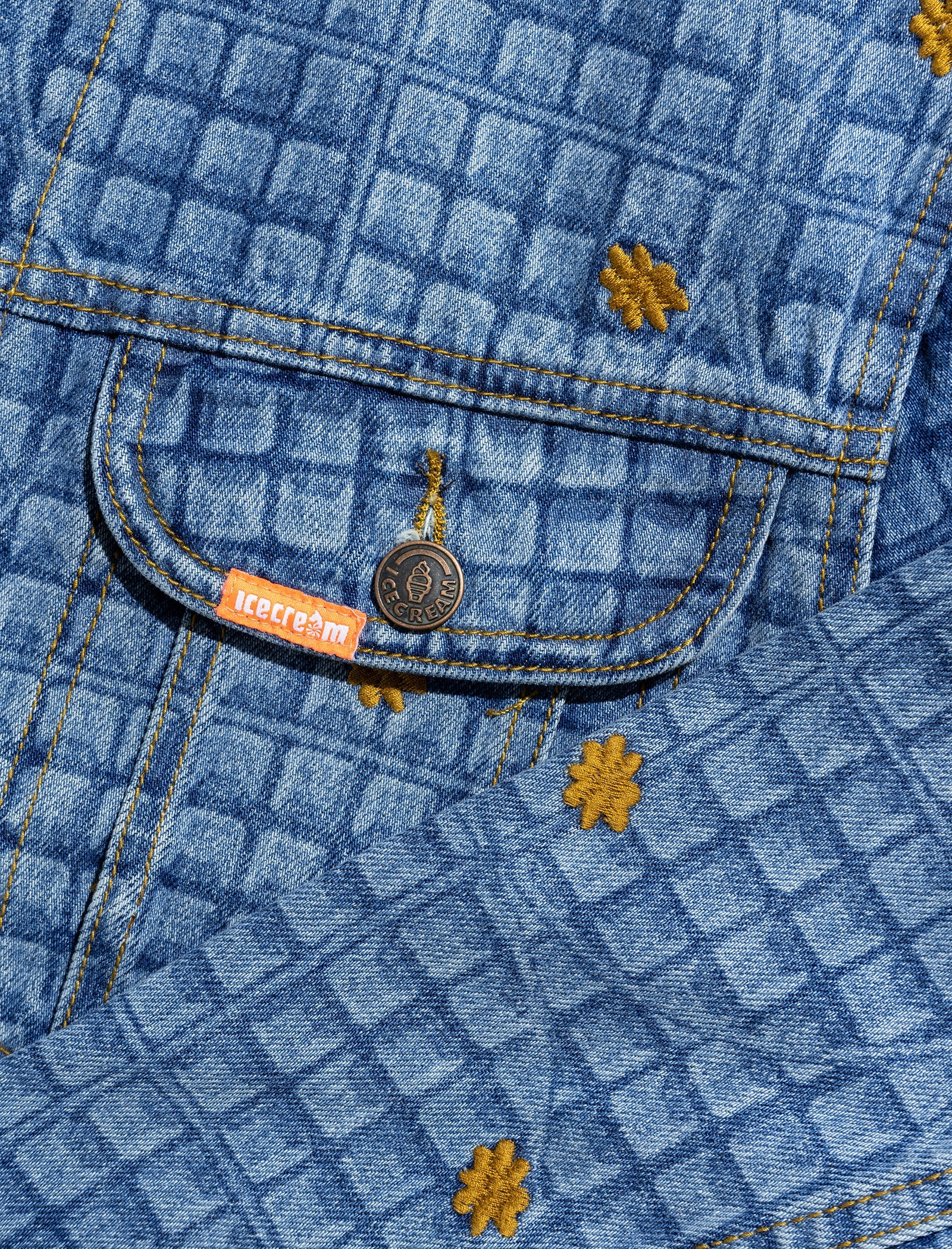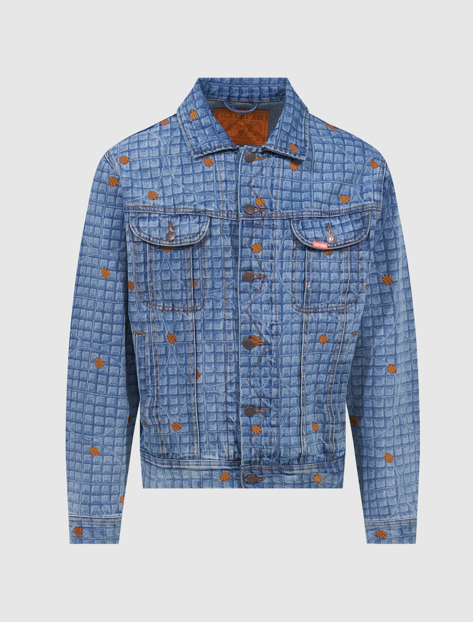 Denim jacket. Spread collar. Graphic print throughout. Two pockets at chest. Button cuffs. Copper-tone hardware. Button closures at front.