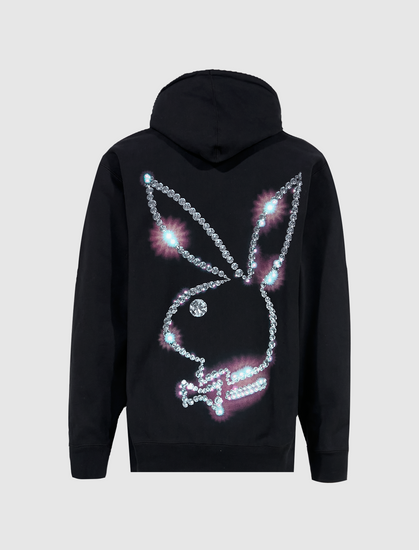 Cotton fleece hoodie. Adjustable drawstrings at the hood. Logo printed on the front. Kangaroo front pocket. Graphic printed on the back. Ribbed cuffs and hem.