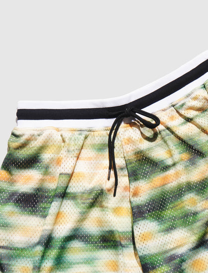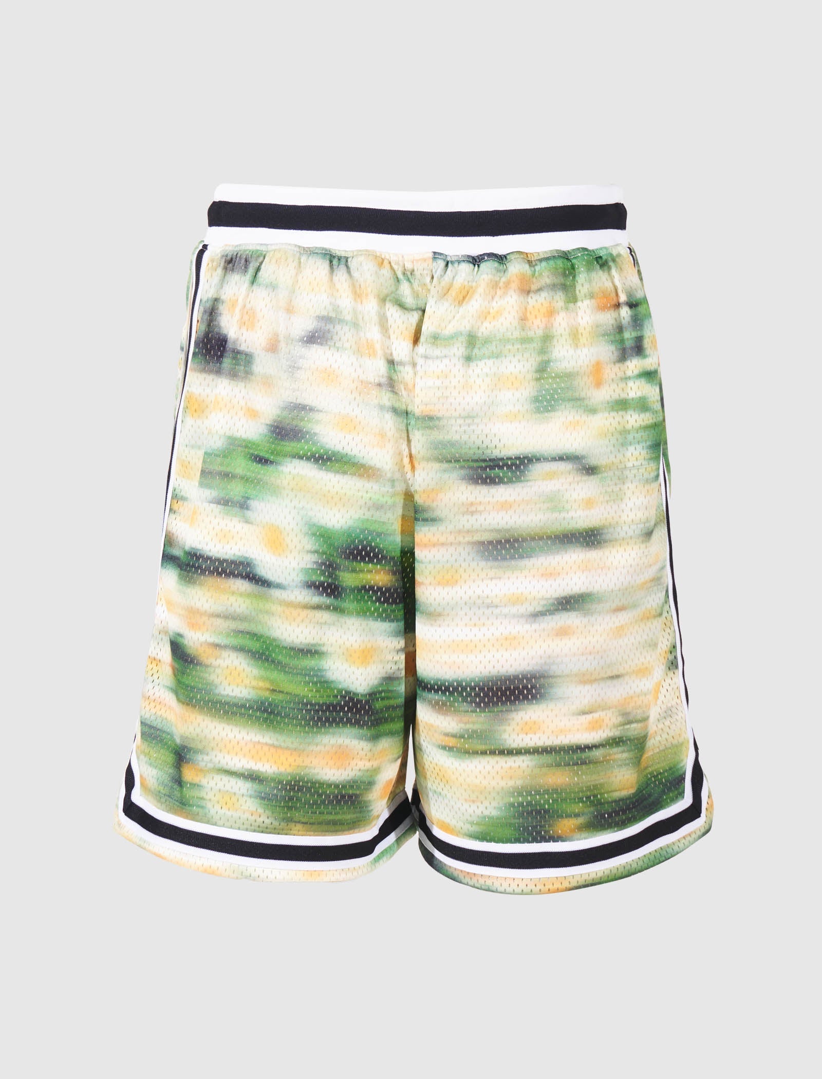 Relaxed-fit mesh shorts. Elasticized drawstring waistband. Two pockets at sides. Graphic print throughout.
