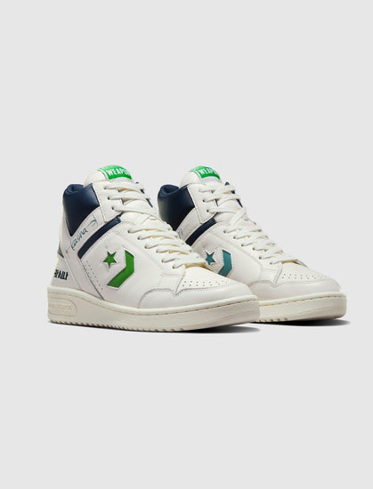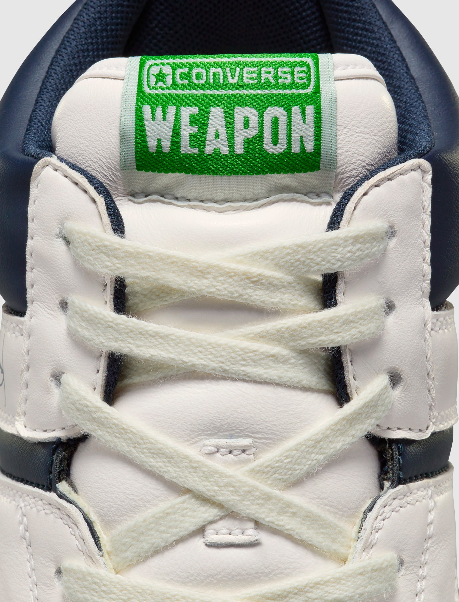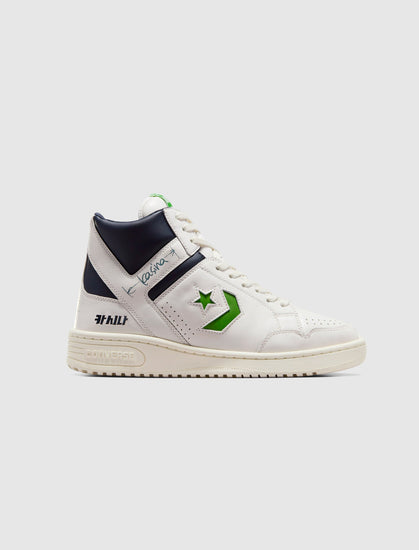 High top sneakers. Leather upper. Leather overlays around the toe, eyelets, collar, and heel counter. Padded collar. Front lacing. Perforated leather toe box and side panels. Cut-out logo on the side panels. Rubber midsole. Rubber outsole.