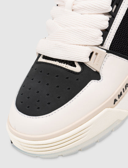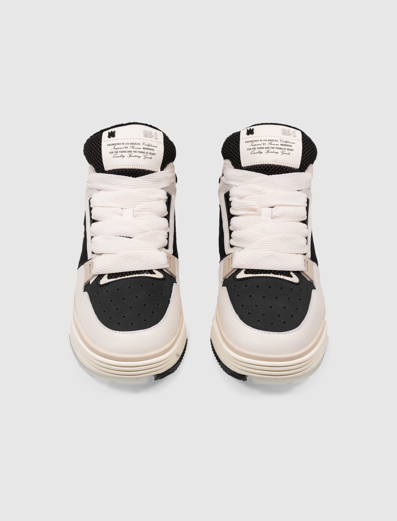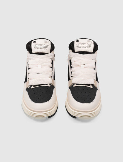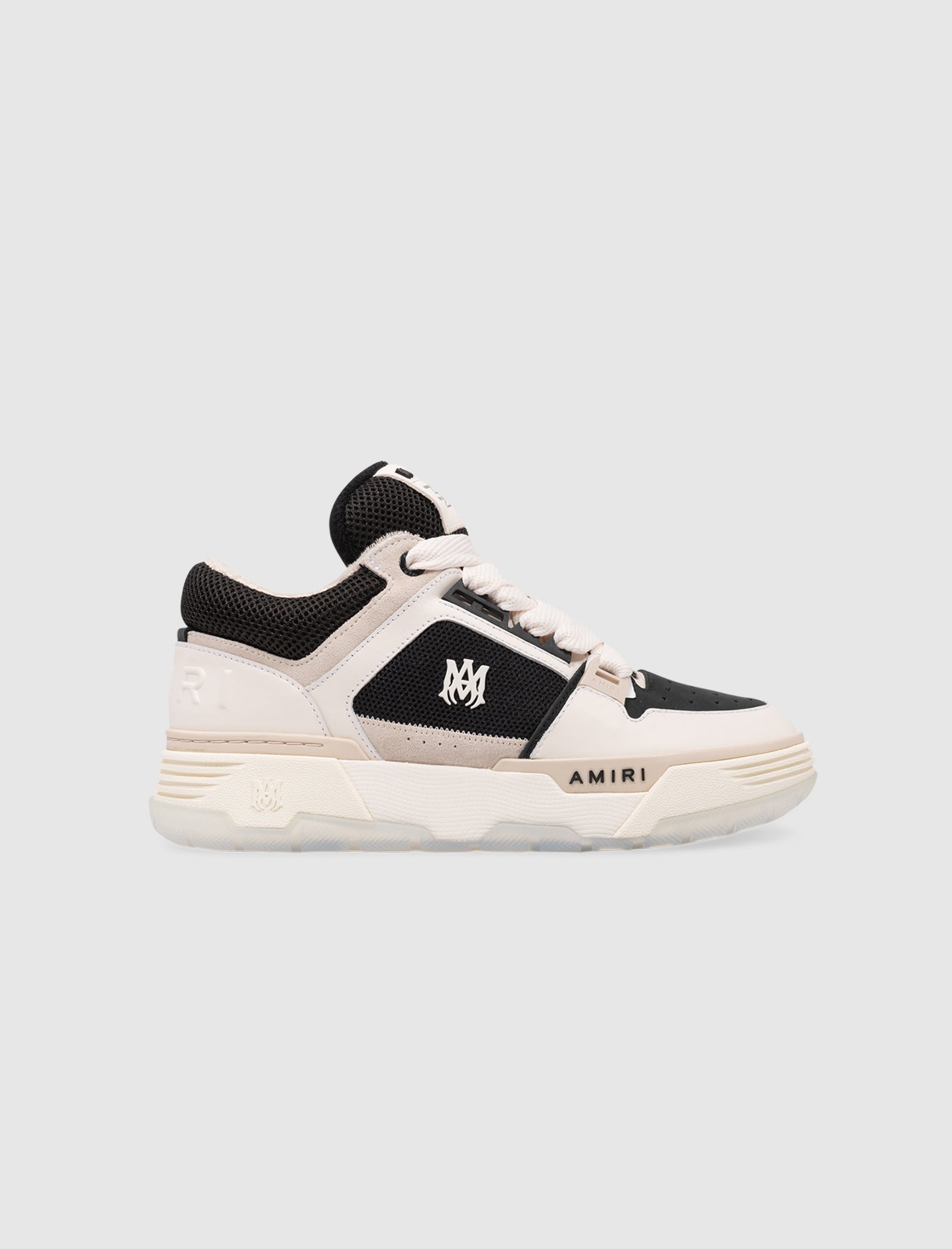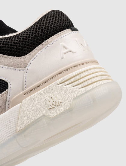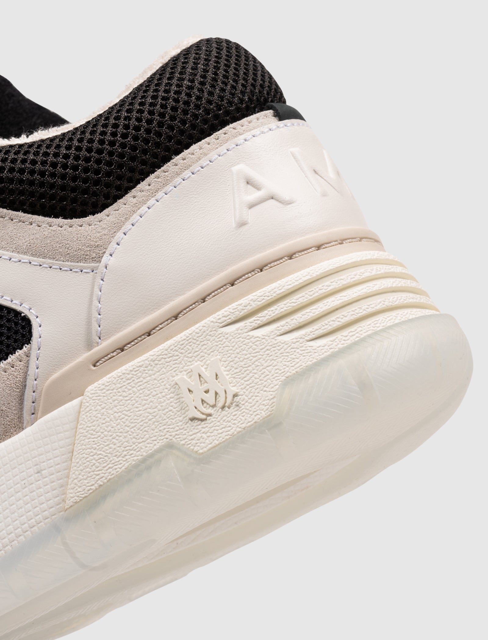 Low top sneakers. Synthetic TPU mesh upper. Leather perforated toe box. Leather overlays around the toe, eyelet panels, and heel counter. Suede accents. Front lacing. Padded mesh tongue. Synthetic TPU logos on the side panels. Chunky rubber midsole. Rubber outsole.