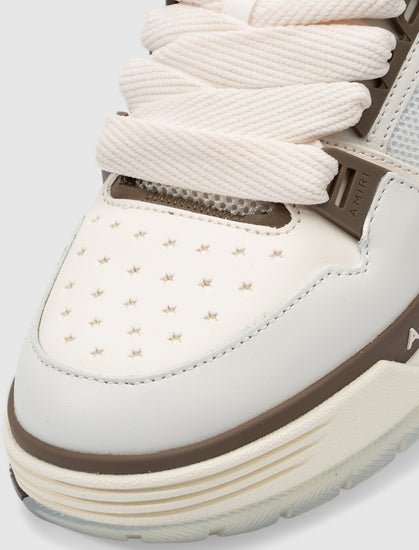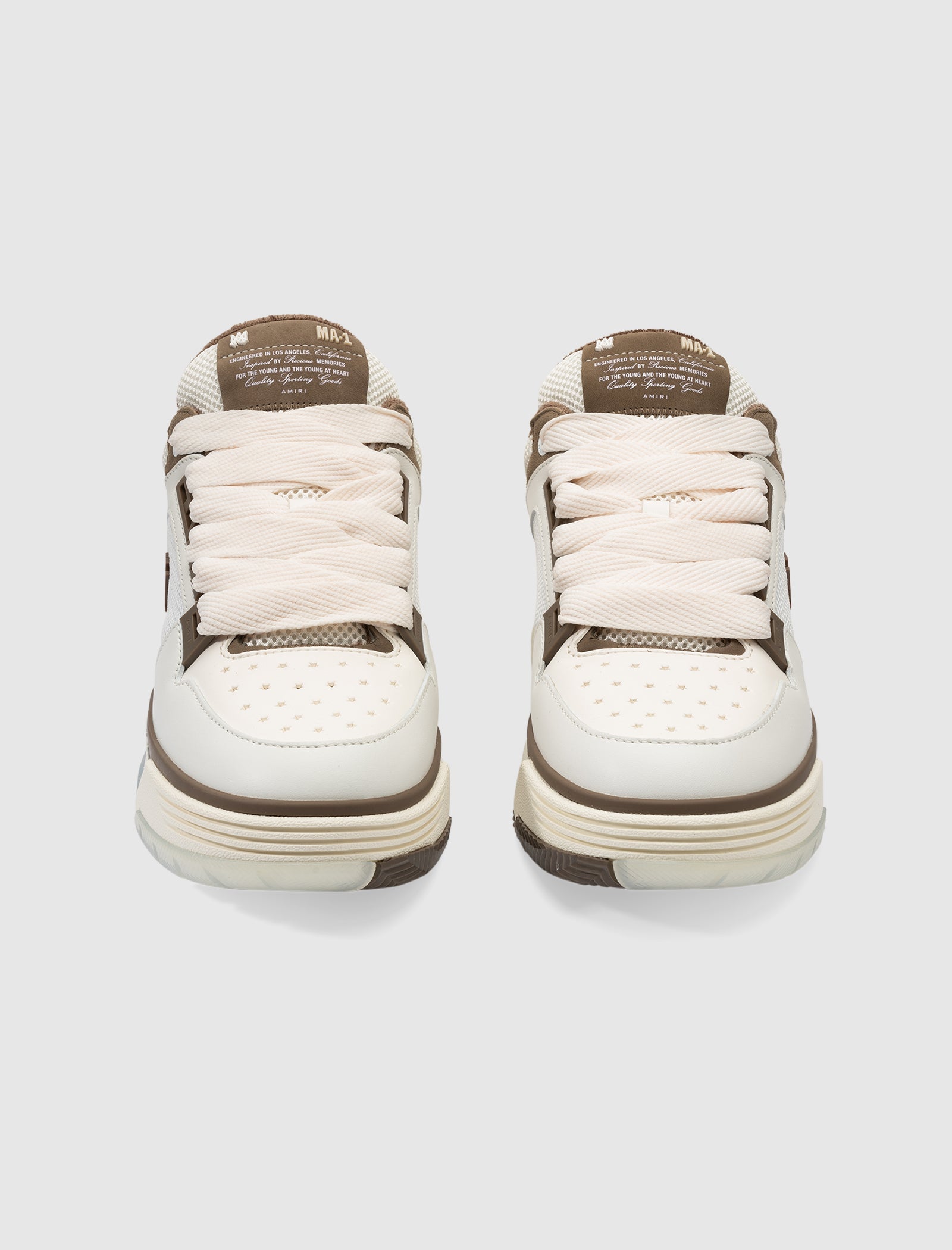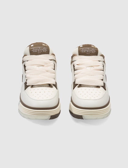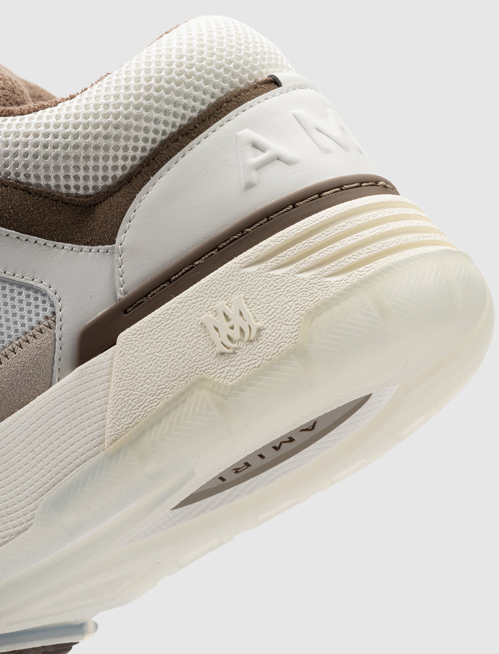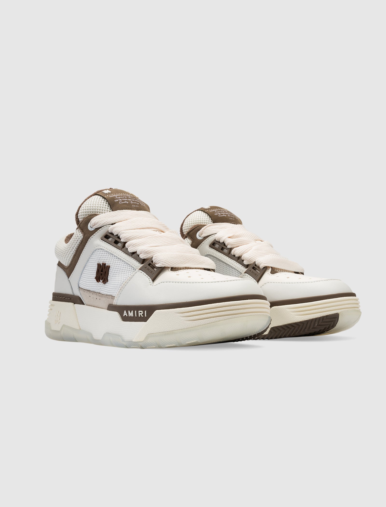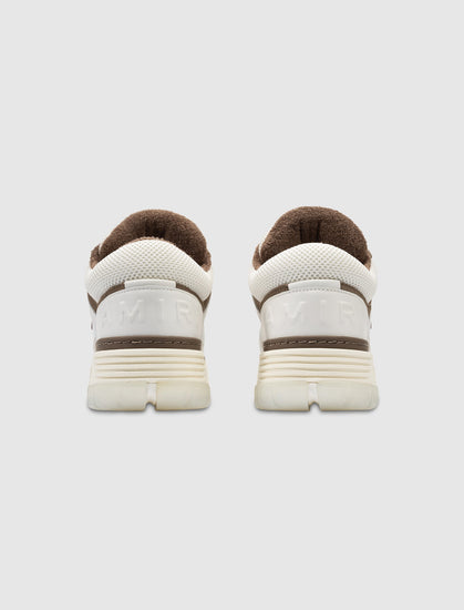 Low top sneakers. Leather upper. Leather perforated toe box. Leather overlays around the toe, eyelet panels, and heel counter. Suede accents. Front lacing. Padded mesh tongue, and collar. Synthetic TPU logos on the side panels. Chunky rubber midsole. Rubber outsole.