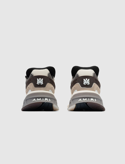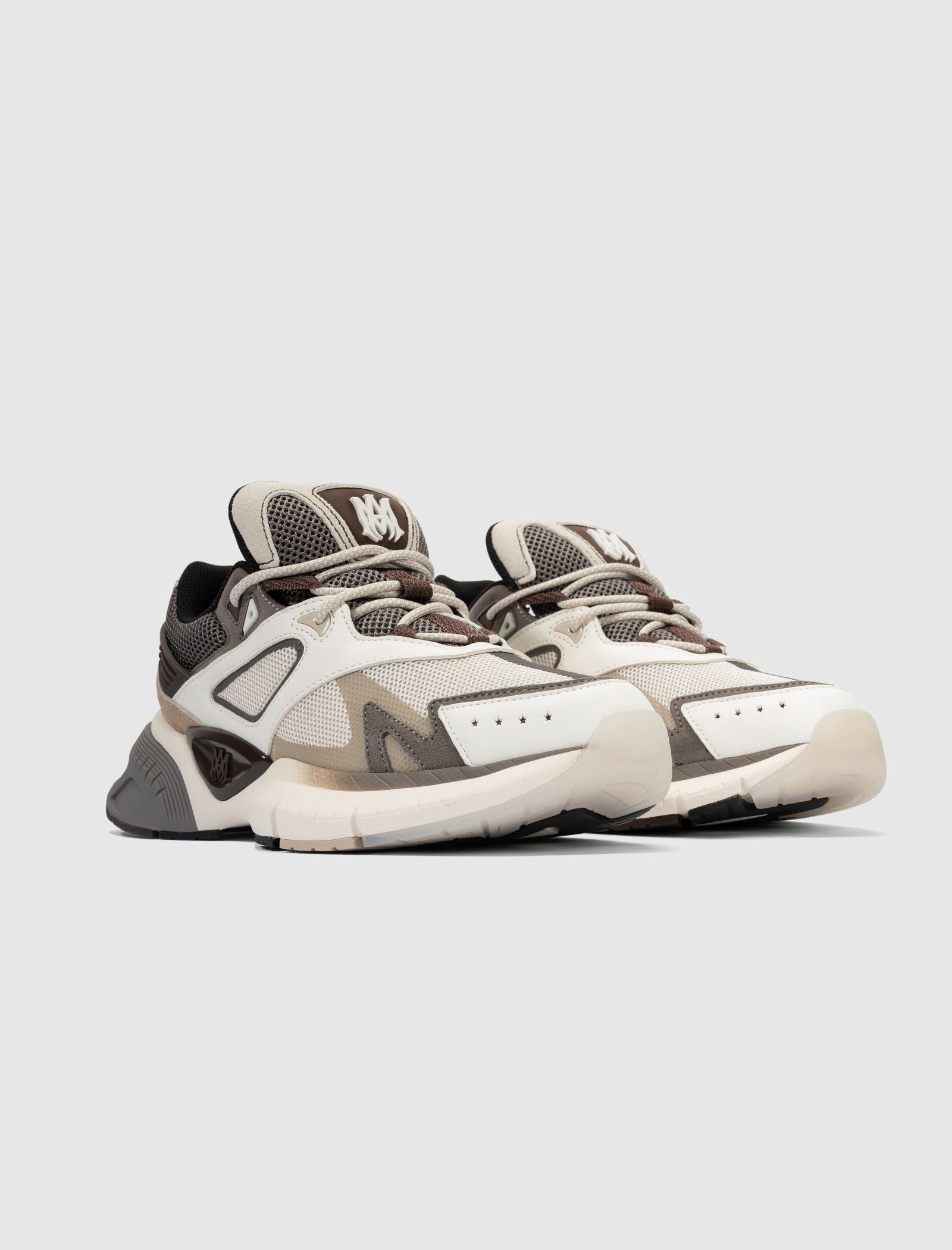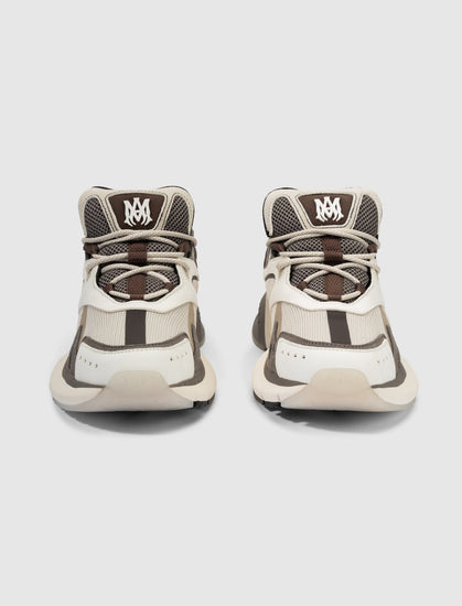 Low-top sneakers. Synthetic padded mesh upper. Leather overlays around the toe, side panels, and eyelet panels. Suede trim accents on the toe, tongue, back of collar, and heel counter. Synthetic TPU heel counter. Front lacing. Logo emblem at the center of the tongue. Chunky composite foam midsole. Rubber outsole.