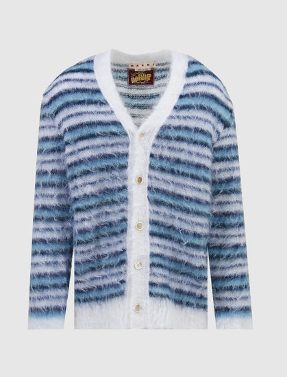 Mohair-blend cardigan. V-neck. Stripes throughout. Button closures at front.