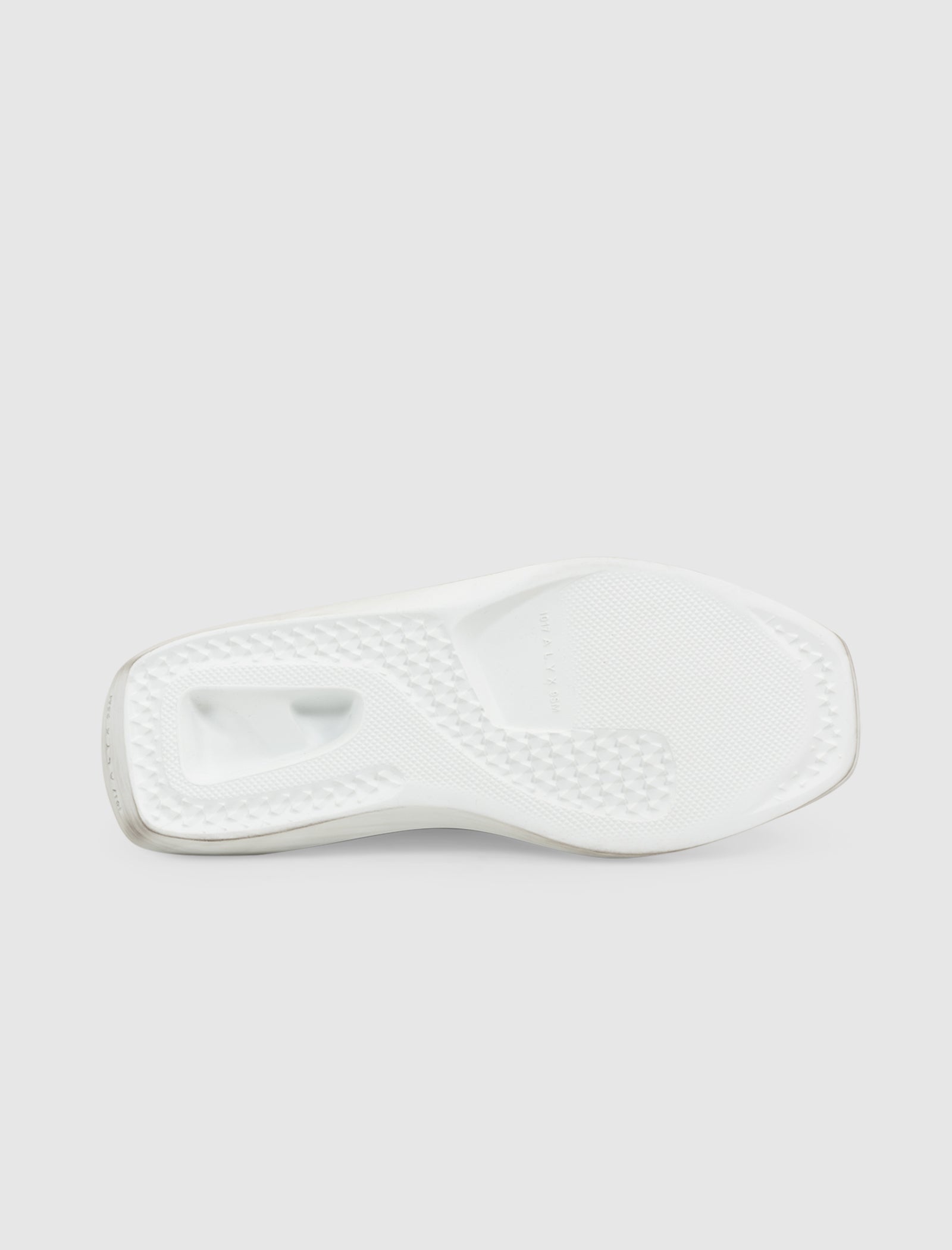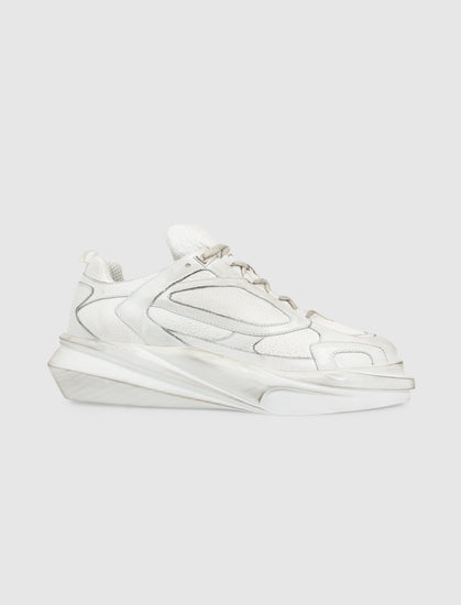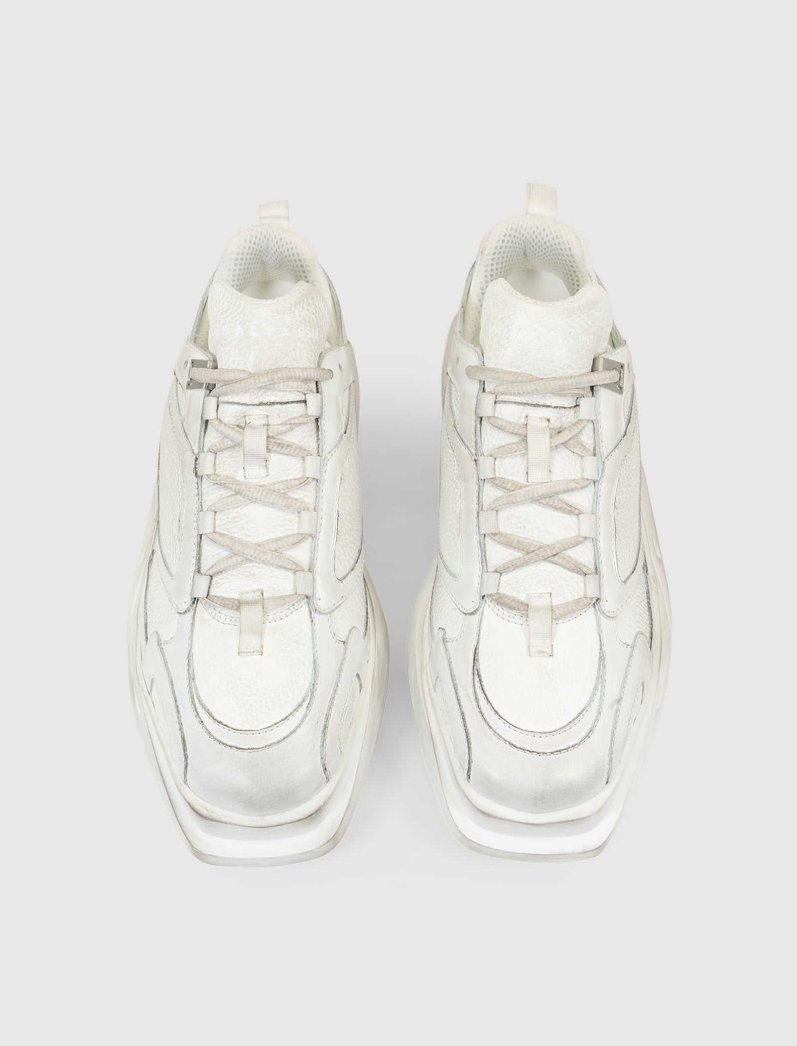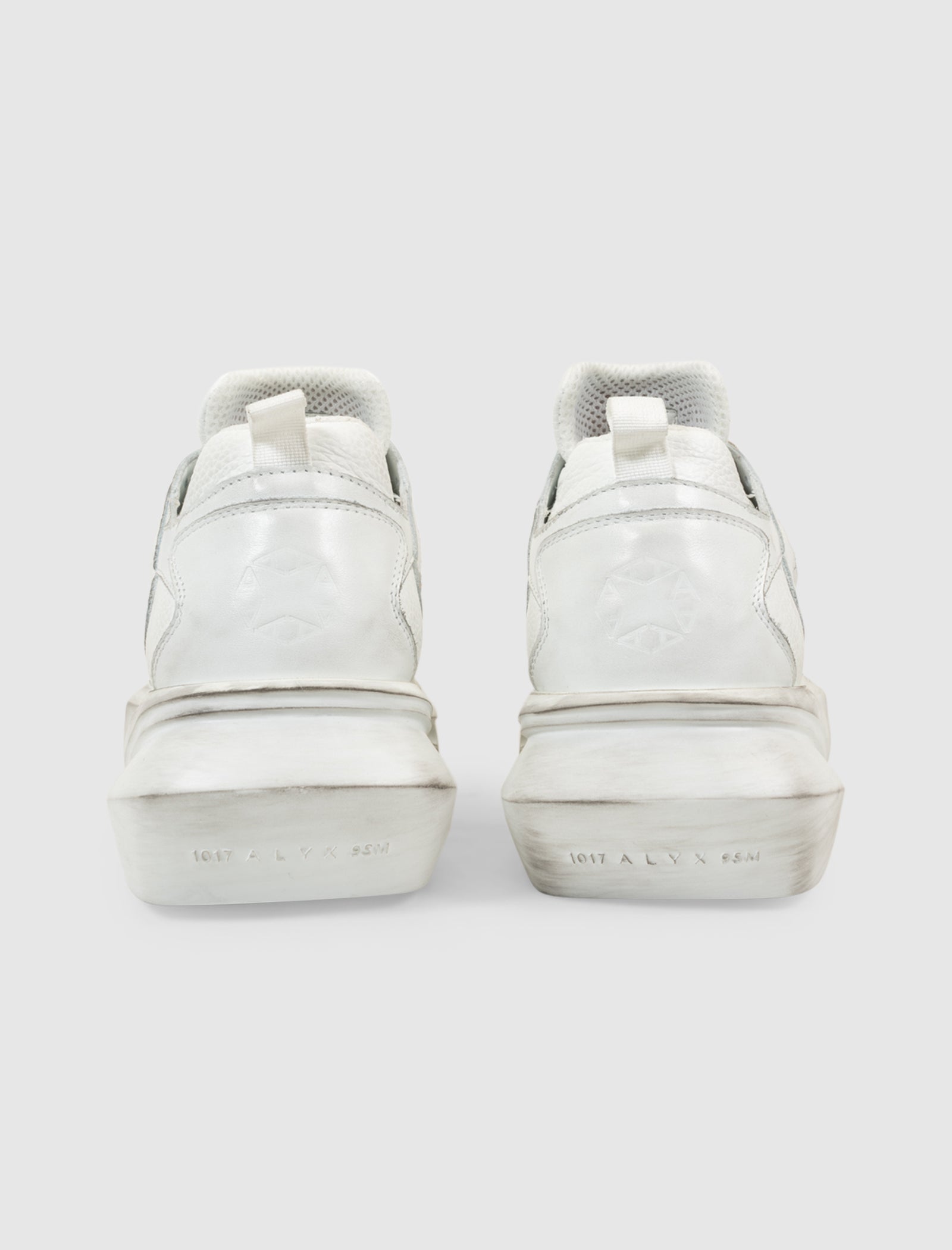 Low top sneakers. Leather upper. Leather overlays layered around toe box, eyelet panels, side panels, collar, and heel counter. Silver-tone metal eyelet. Front lacing. Jagged rubber midsole. Rubber outsole. Discolored accents all throughout.