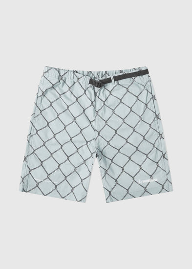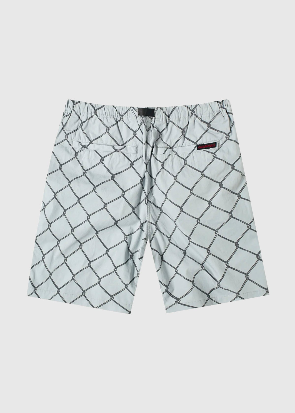 Cotton climbing shorts. All-over-print graphic pattern. Small branded embroidery on both thighs. Elastic waistband with a webbing belt. Double back pockets with velcro closure.
