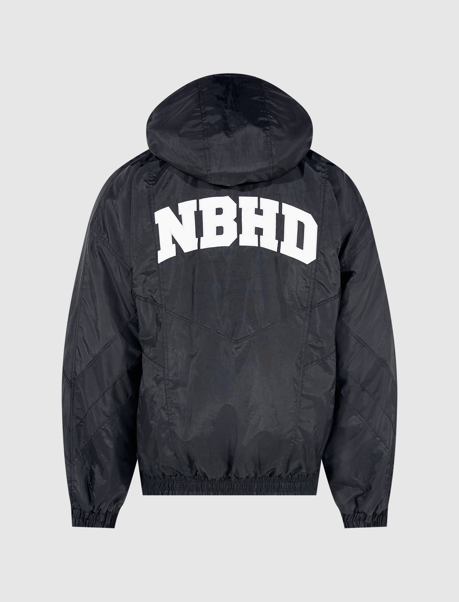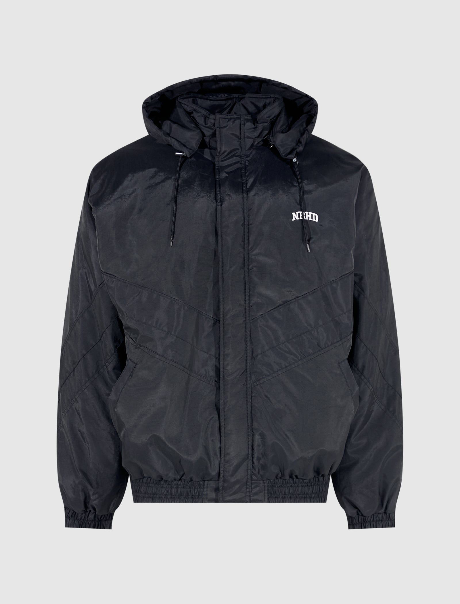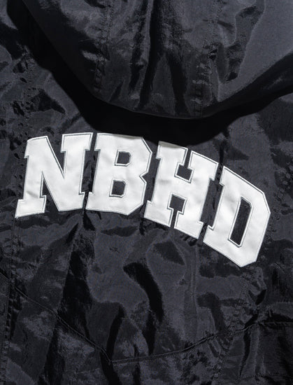 Nylon jacket. Adjustable drawstring hood. Embroidered logo text at chest and back. Two pockets at sides. Elasticized cuffs and hem. Snap and zip closures at front.