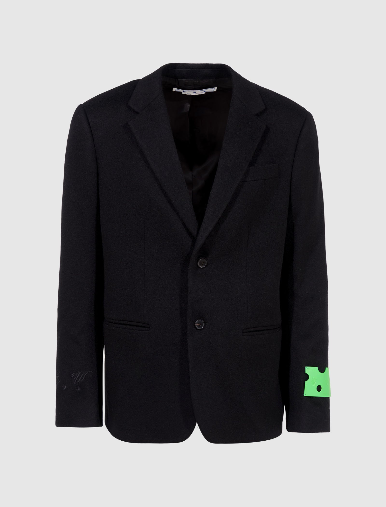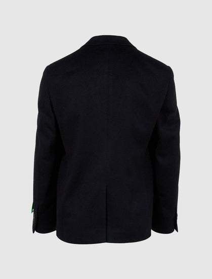 Cashmere blazer jacket. Notched lapels. Signature hands off logo. Single vent at back. Button closures at front.