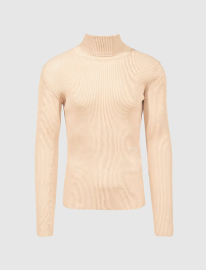 Fitted ribbed knit sweater. Turtleneck. Ribbed knit detail throughout.