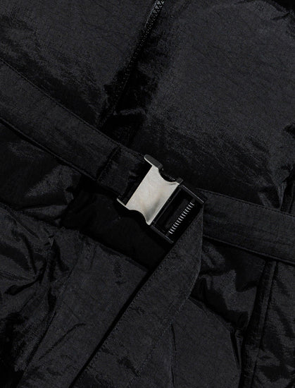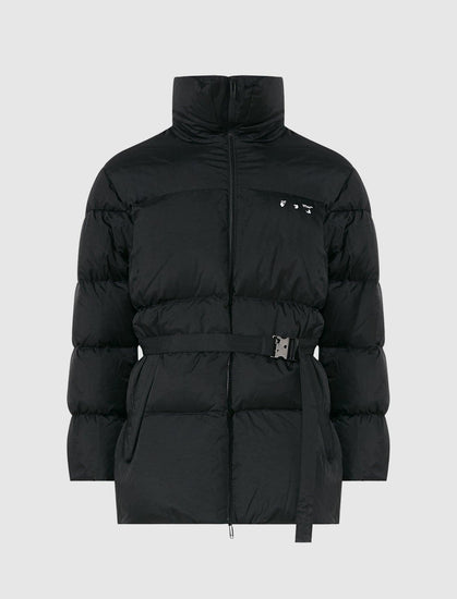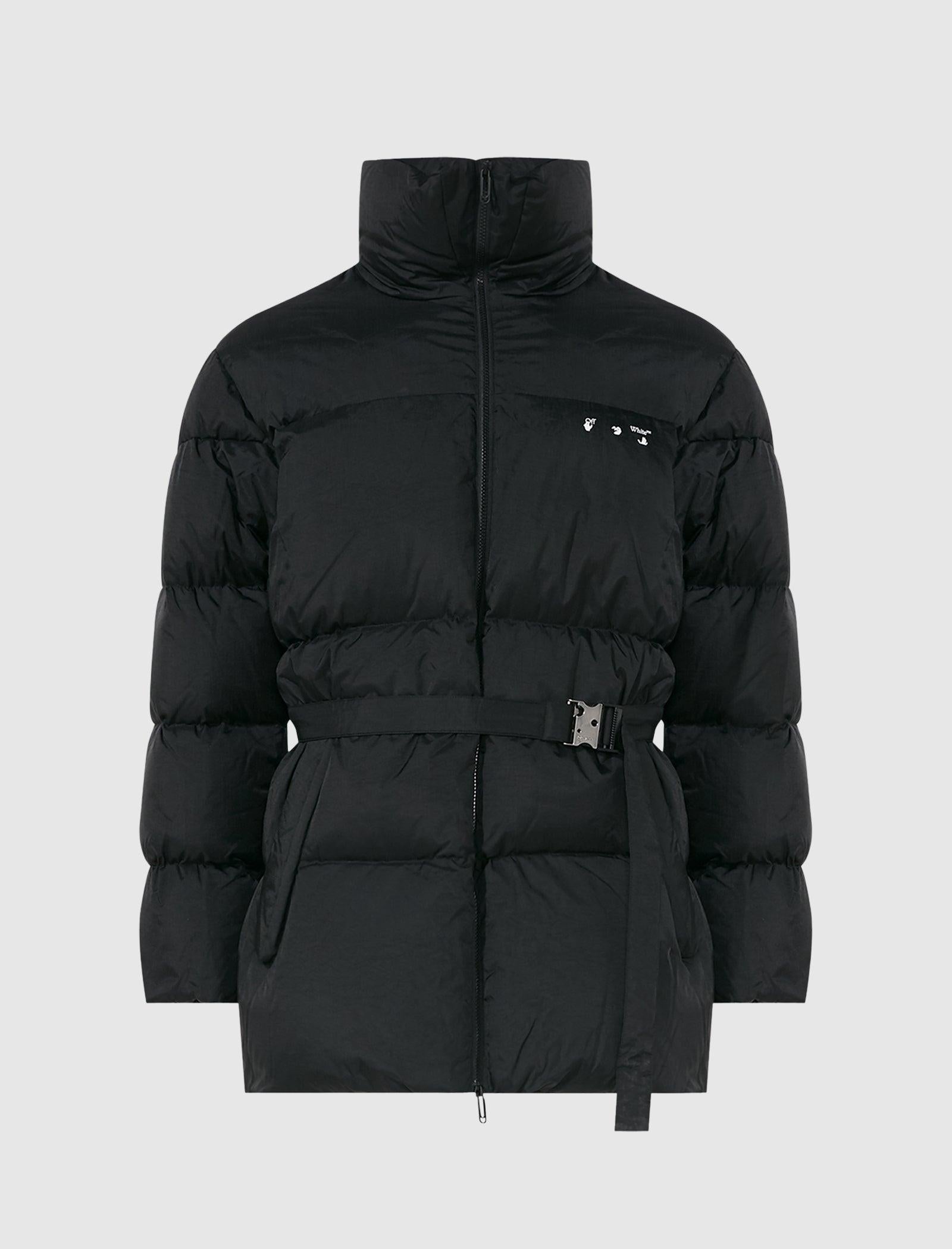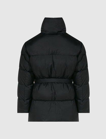 Padded jacket. Funnel neck. Embroidered logo at chest. Belt at waist. Two pockets at sides. Zip closure at front.