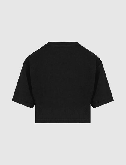 Cropped ribbed knit tee. Crewneck. Embroidered logo text at chest.