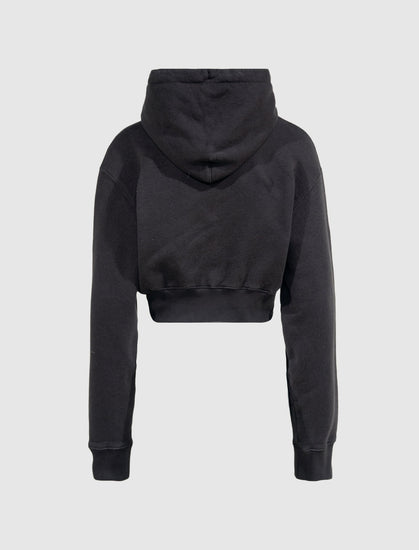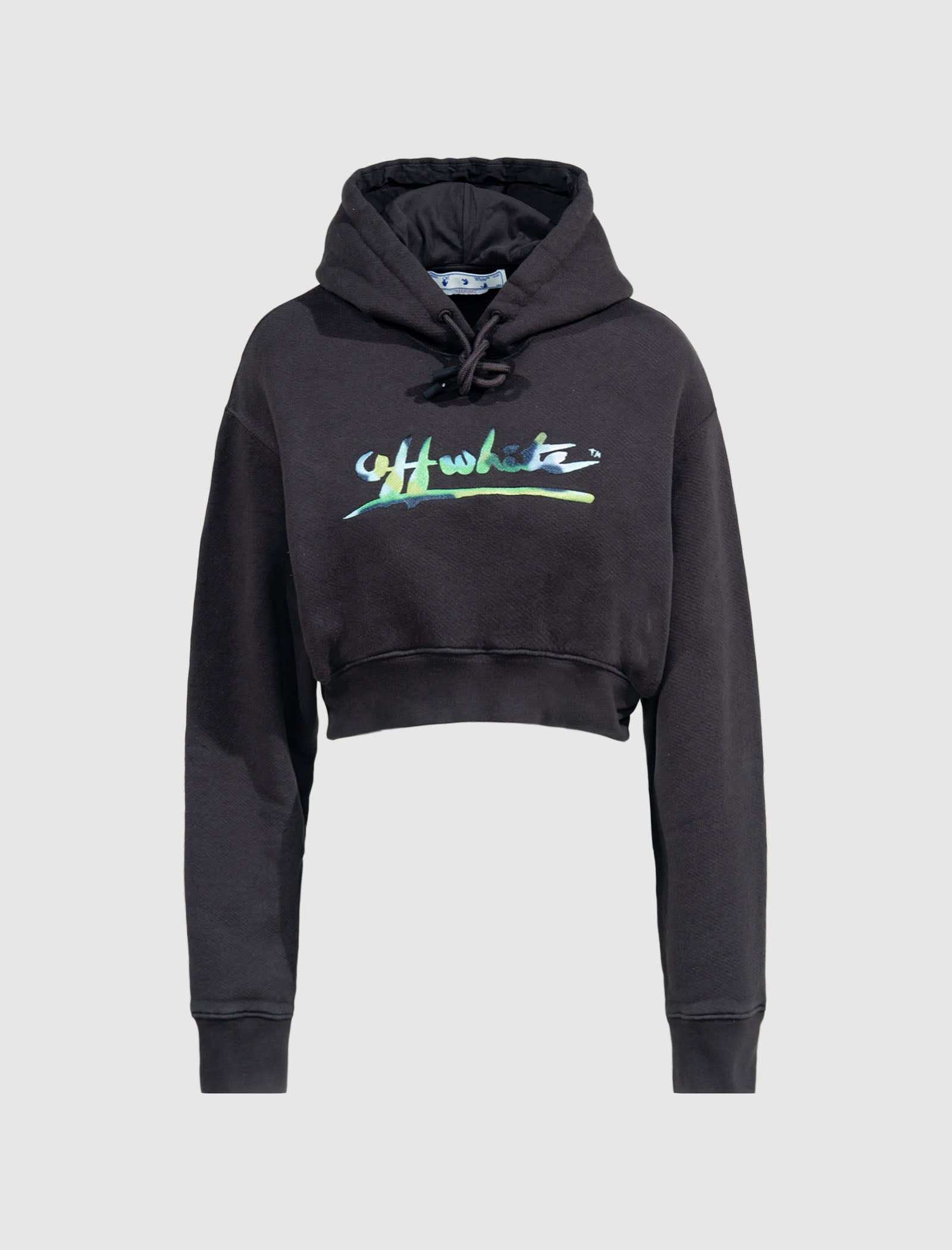Pullover crop hoodie. Adjustable drawstring hood. Graphic logo text featuring tie-dye print at chest. Ribbed cuffs and hem.