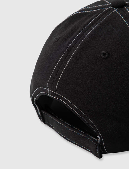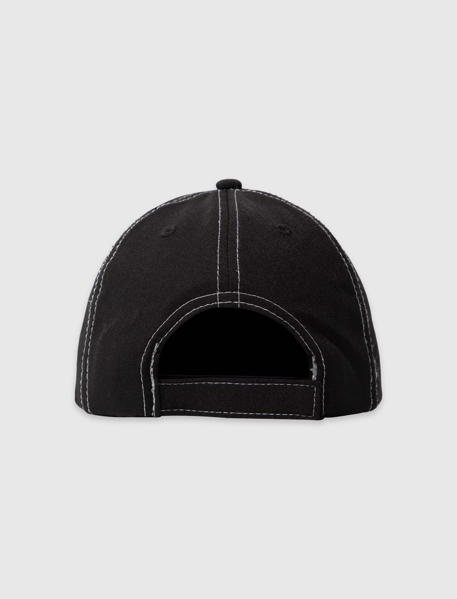 Nylon hat. Curved brim. Rubberized logo patch on the front. Velcro back strap.