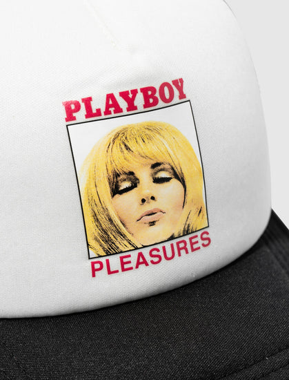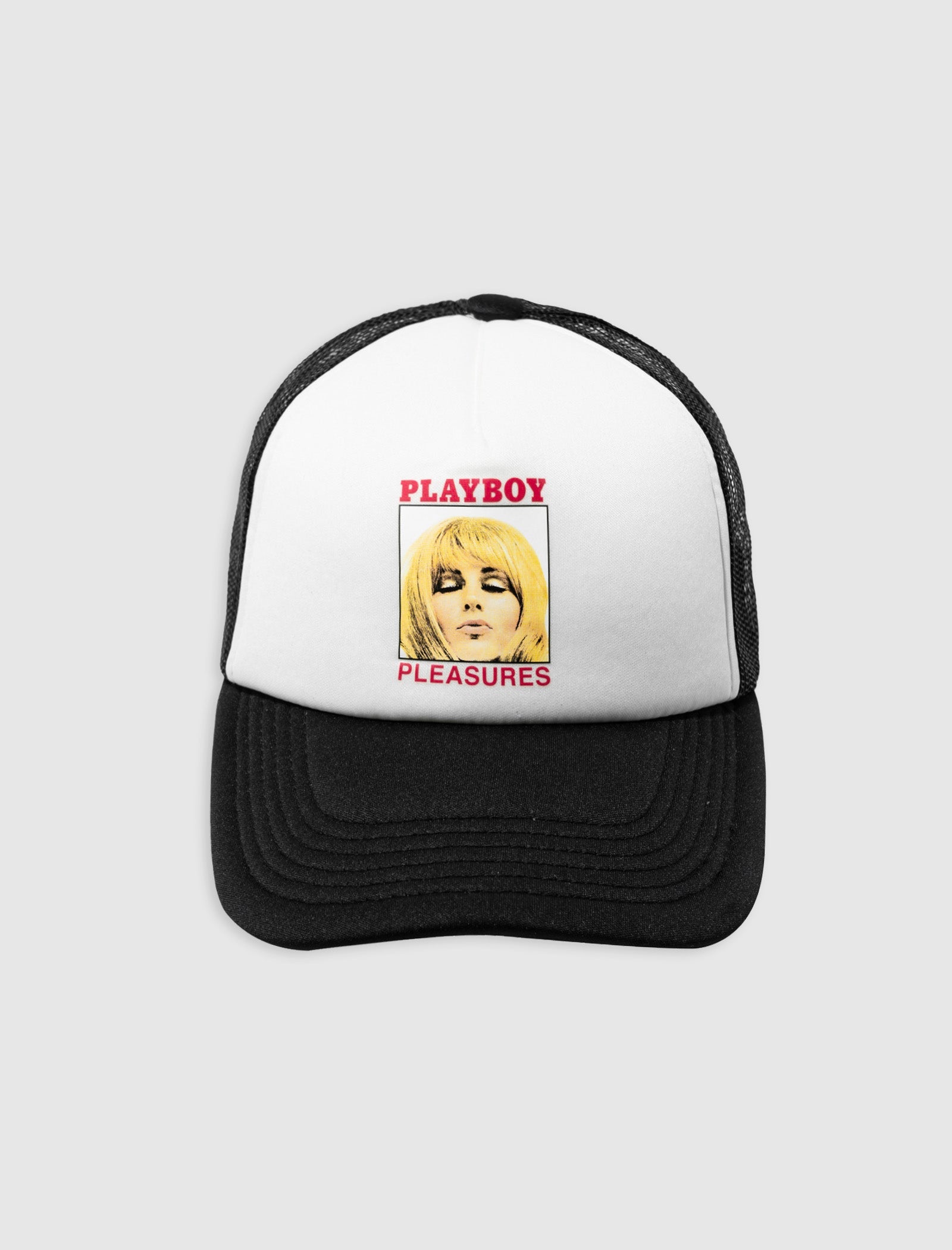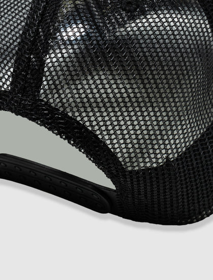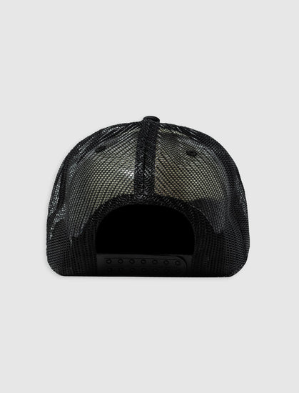 Trucker hat. Curved brim. Graphic logo text, print and text at front. Mesh panels. Adjustable snapback closure.