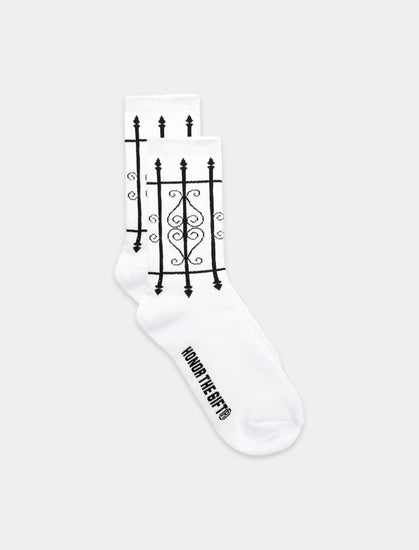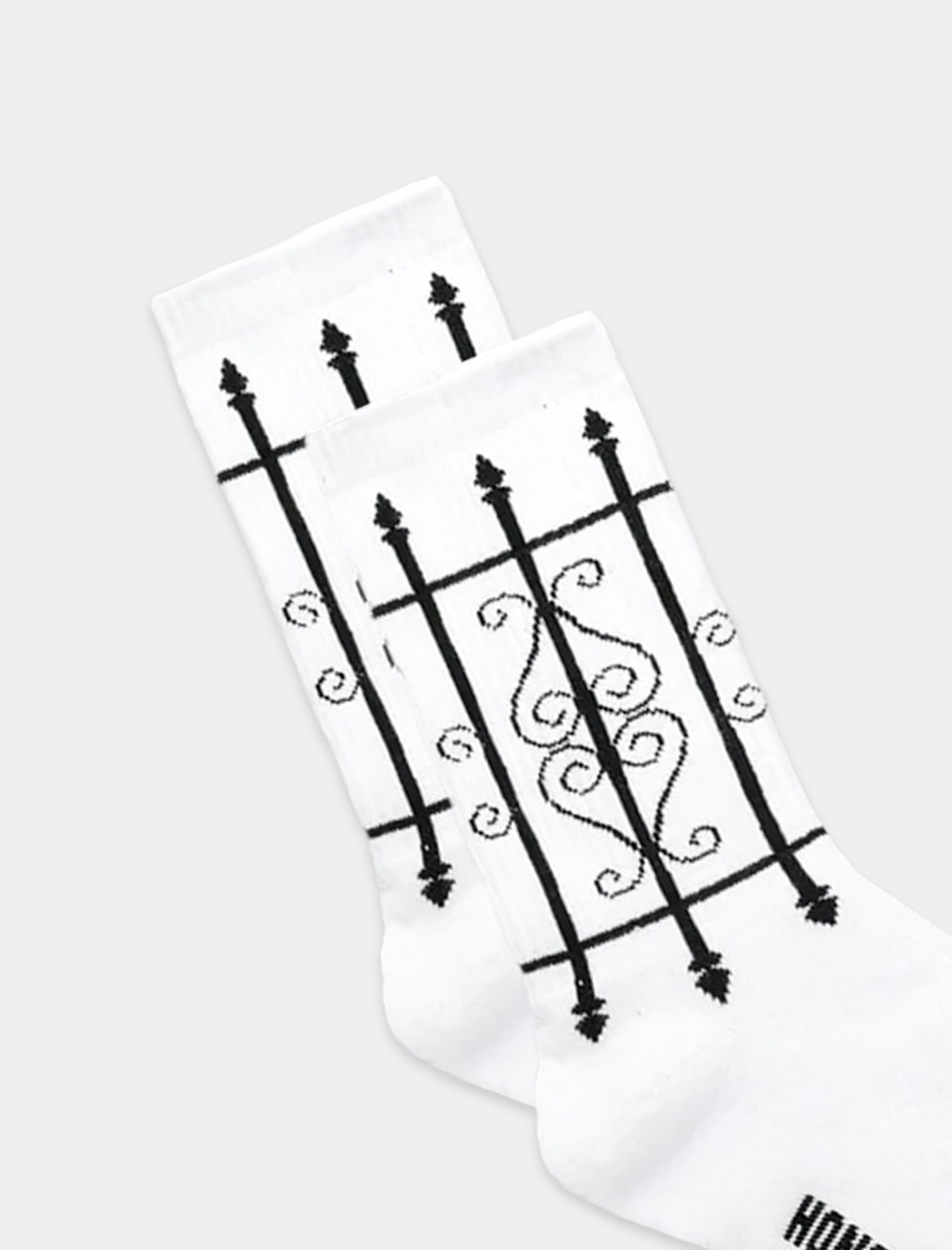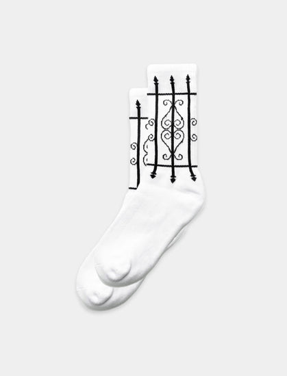 Ribbed cotton crew socks. Knit pattern across the leg. Calf-length.