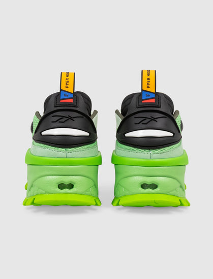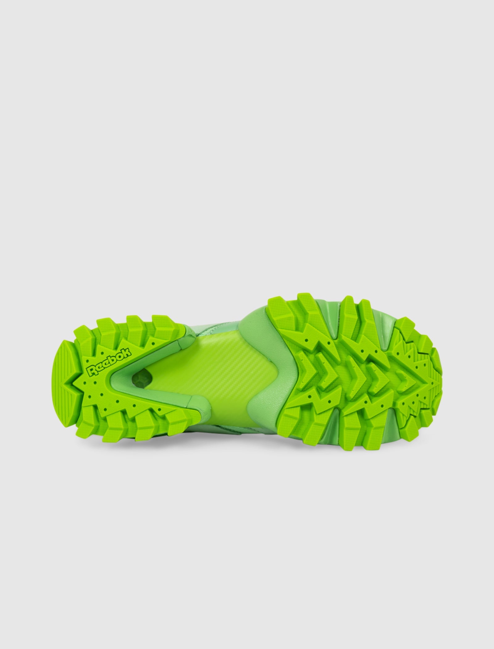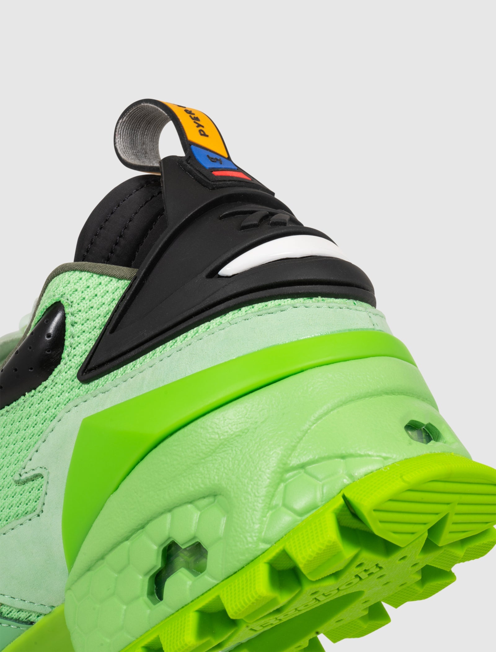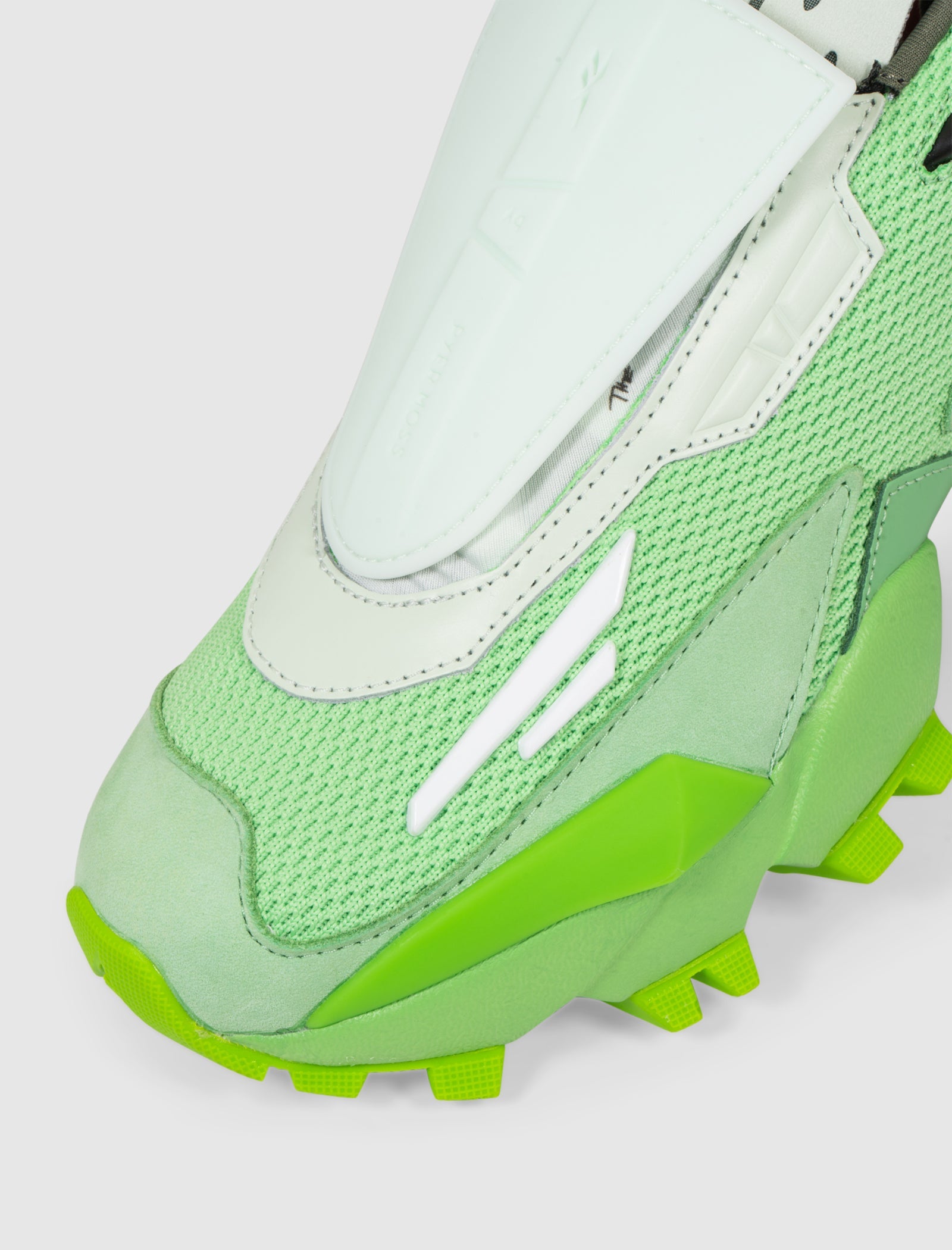 Low top sneakers. Mesh upper. Suede overlays around the toe box, heel counter, and eyelet panels. Rubber inserts on the outer toe, and heel counter. Rubber heel tab with a pull loop attached. Front lacing. Rubber tongue cover. Split foam midsole. Spiked rubber split outsole.
