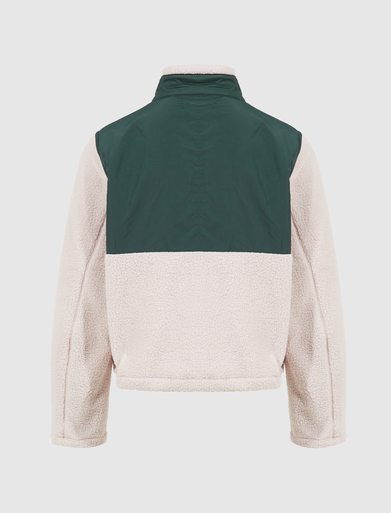 Sherpa fleece jacket. Mock neck. Two pockets at chest. Two pockets at sides. Woven brand label at sleeve. Hook attachment. Drawstring hem. Zip closure at front.