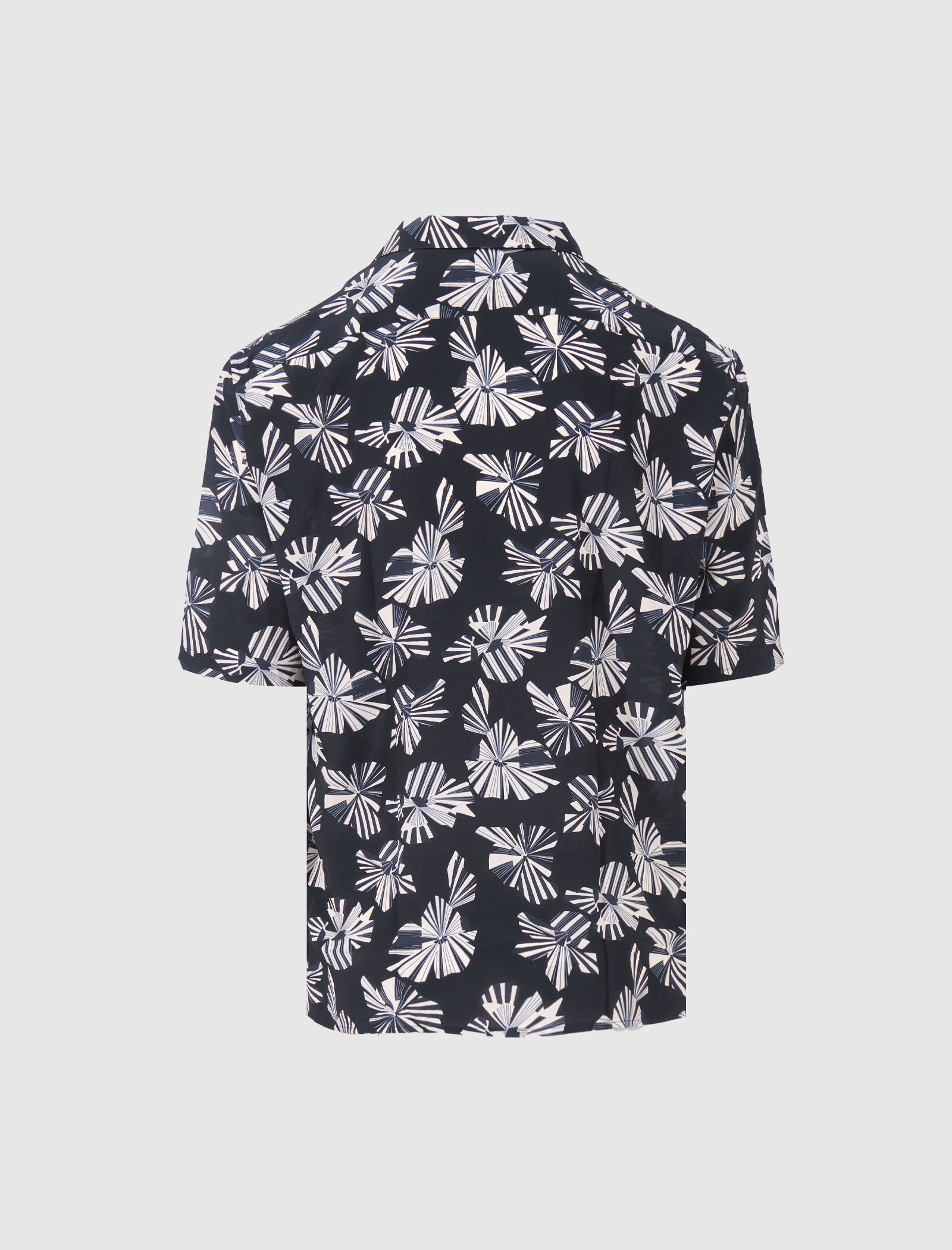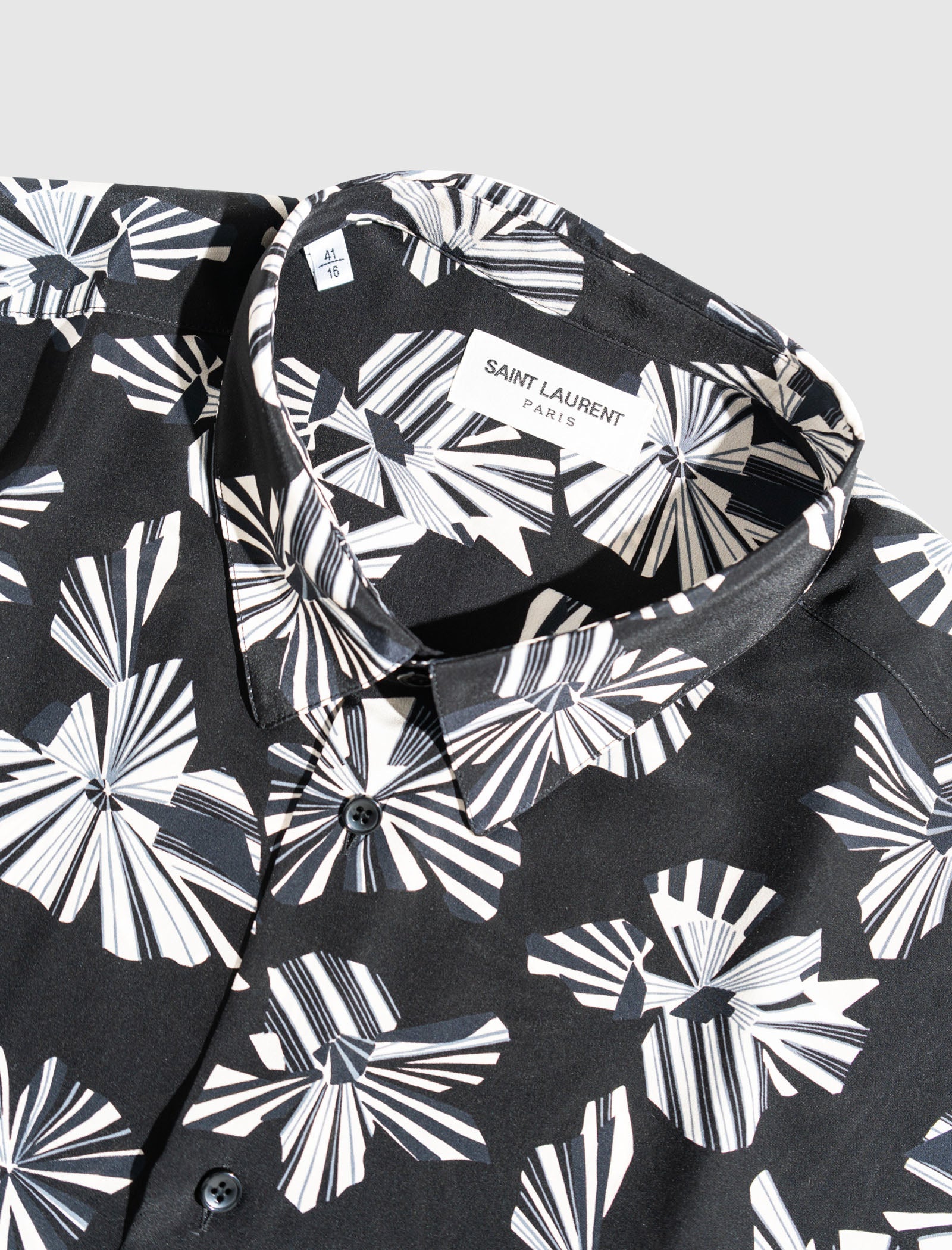 Short sleeve silk shirt. Pointed collar. Floral print throughout. Button closures at front.
