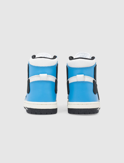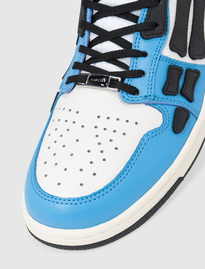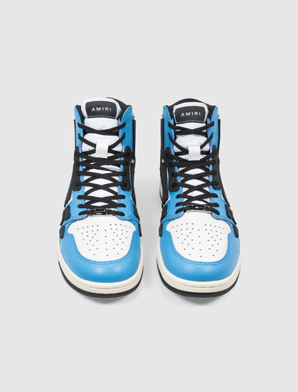 High top sneakers. Leather upper. Leather overlays around the toe, eyelet panels, collar, and heel counter. Perforated leather toe box. Front lacing. Leather tongue. Suede bone-shaped applique patches stitched on the side panels. Rubber midsole. Rubber outsole.
