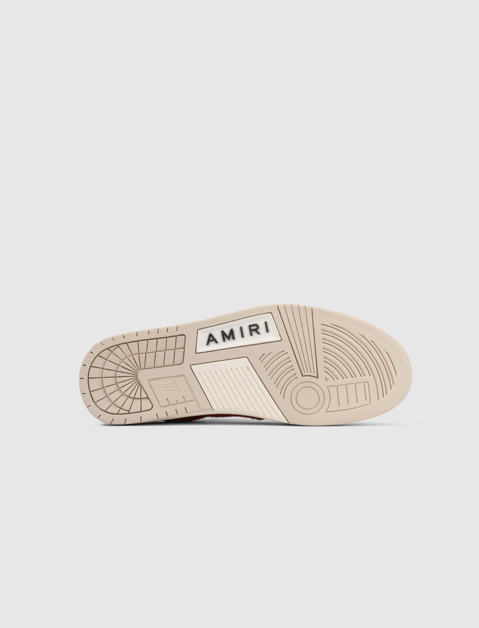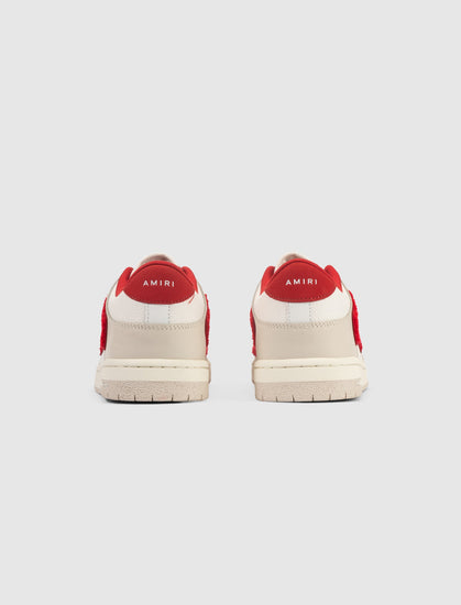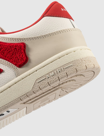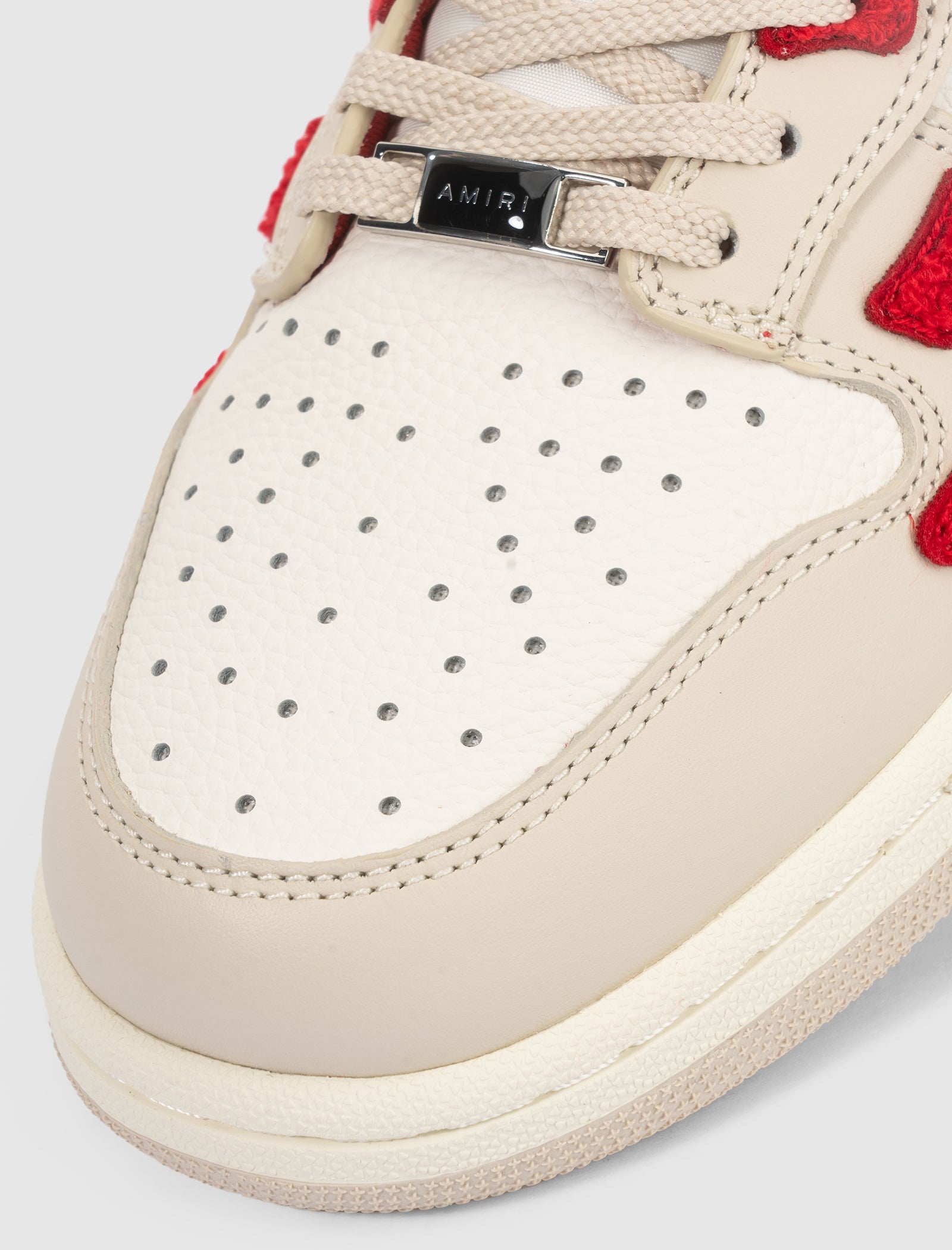 Low top sneakers. Leather overlays around the toe, eyelet panels, and heel. Perforated leather toe box, side panels, and collar. Front lacing. Bone shaped chenille patchwork stitched on the side panels. Rubber midsole. Rubber outsole.